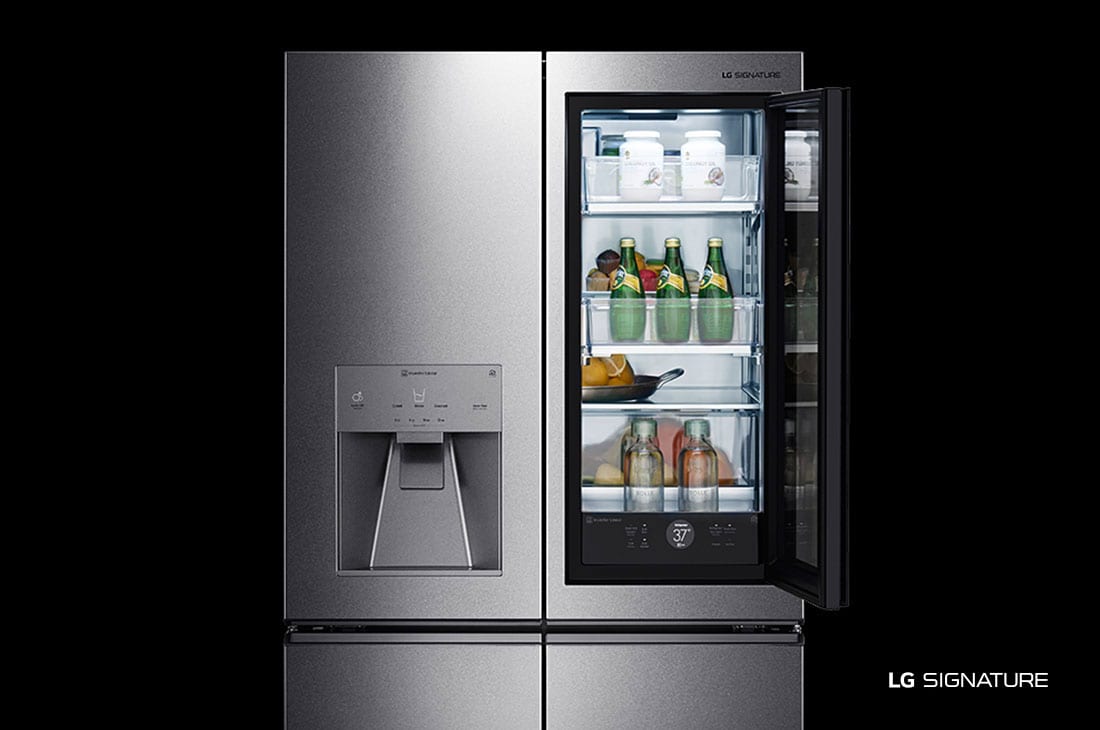 El modelo LG Signature LSR100 con puerta Door Interview incluye una puerta de cristal que hace que la luz se encienda y podamos ver qué hay en la nevera sin necesidad de abrirla, evitando así el derroche energético. Con este modelo también se puede abrir una puerta de cristal pequeña para acceder al compartimento exterior con alimentos de uso más frecuente.
