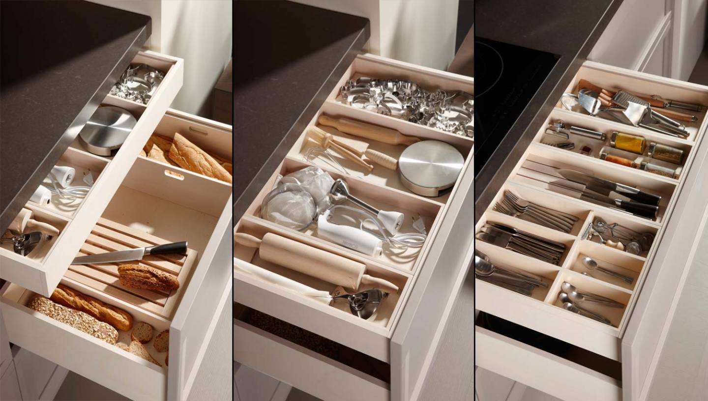El cajón de los cubiertos debe contar con un separador que se ajuste bien a sus dimensiones, y que tenga los huecos adecuados para cada utensilio. El mercado te ofrece una amplia gama de ellos, incluidos los de materiales sostenibles o los de diseños personalizados. Valora bien cada propuesta.