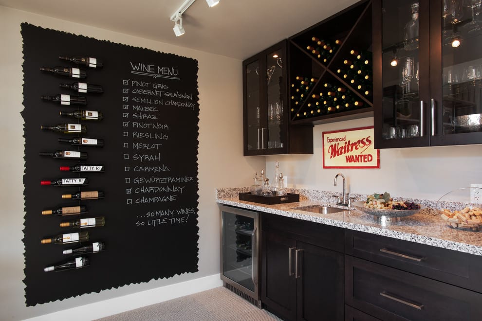 Si colocamos la vinoteca junto a la pizarra, ésta sirve como carta de vinos. Es un modo original de sorprender a los invitados y saber en cada momento qué vino tenemos en casa.