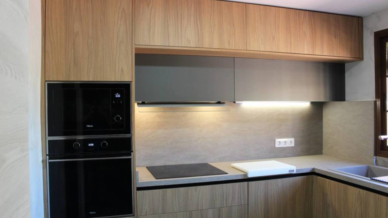 Los aplacados Baido son los grandes protagonistas de esta cocina, pero también cabe destacarla combinación de colores (la madera y el gris) y la estrategia adoptada en los muebles altos para jugar con los volúmenes y ofrecer un espacio agradable, funcional y cómodo.