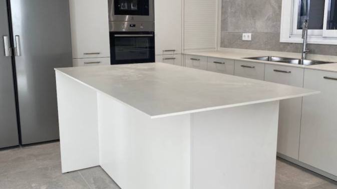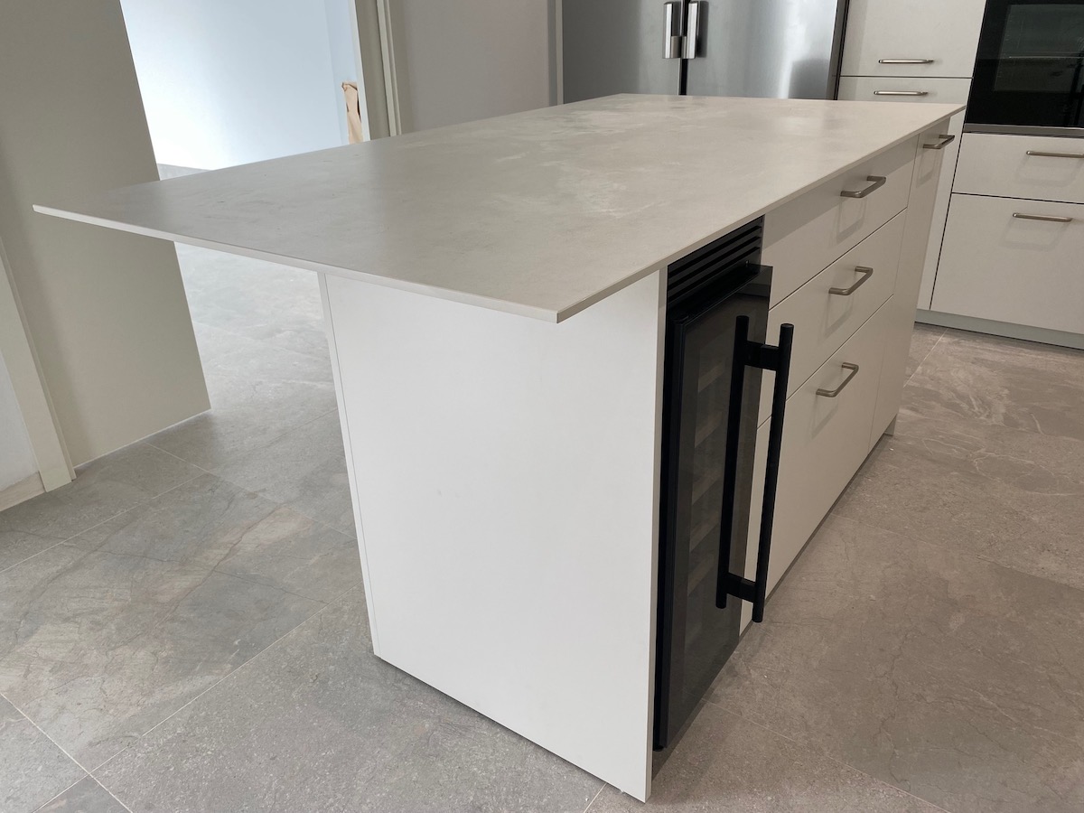La encimera es un elemento clave en cualquier cocina, y en este proyecto se ha optado por el porcelánico italiano INFINITY en color total white satinado con canto simple de 1,2 cm. Esta elección no solo es estéticamente atractiva, sino que también garantiza durabilidad y facilidad de limpieza, lo que es esencial en una cocina.