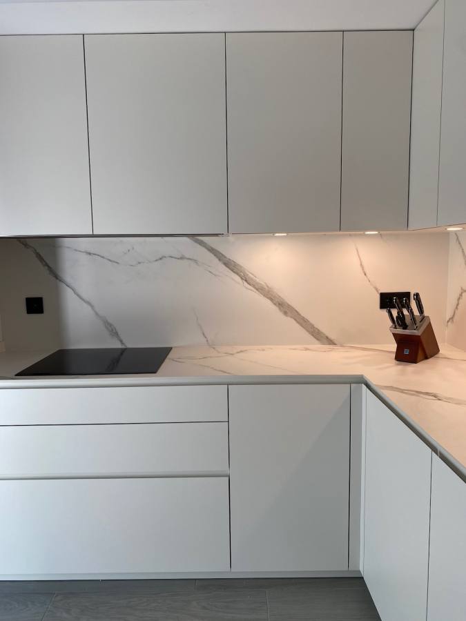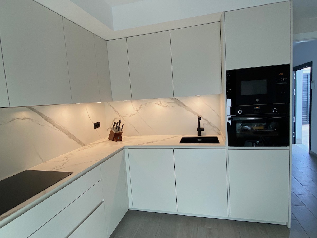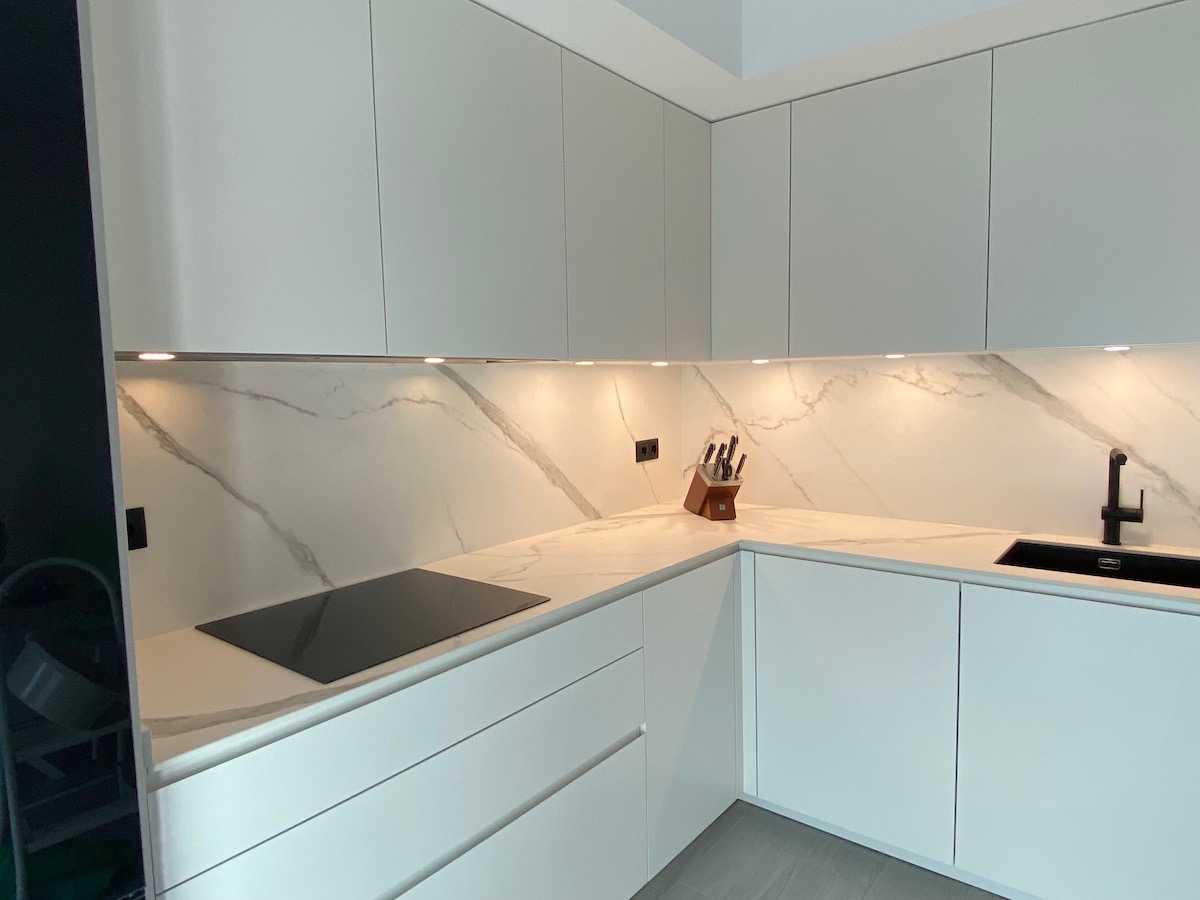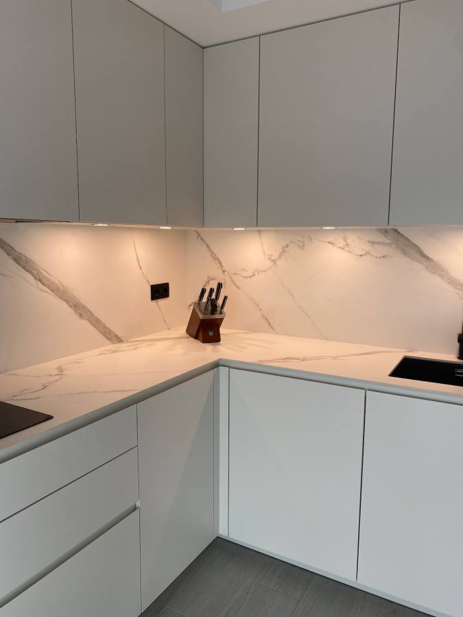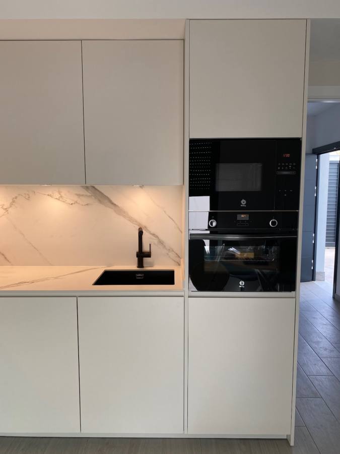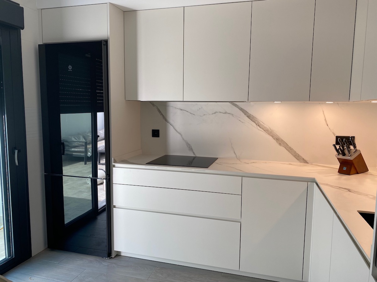 En esta ocasión, nos hemos desplazado a La Rinconada para realizar un trabajo muy especial de la mano de Baben Interiorismo. Este proyecto destaca por la combinación del color blanco latte en los muebles con una encimera porcelánica de INFINITY, modelo Extra Statuario Sat, que incluye un aplacado del mismo material. Este diseño consigue una continuidad de veta que se asemeja a la de las canteras naturales de cuarcita, aportando un toque de lujo y sofisticación.