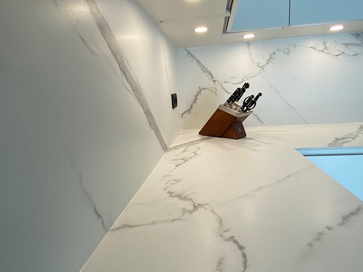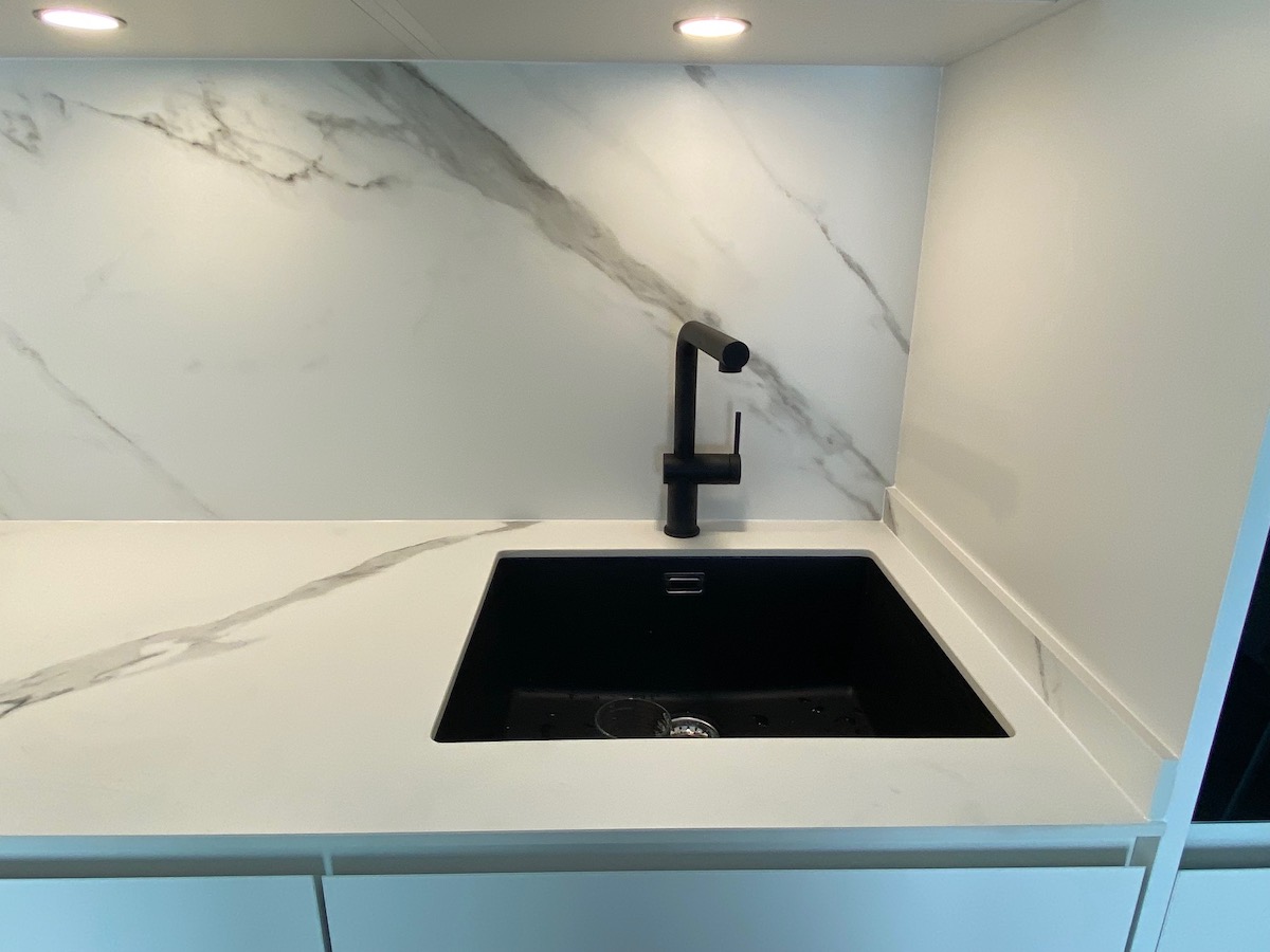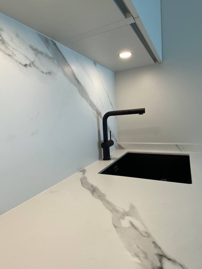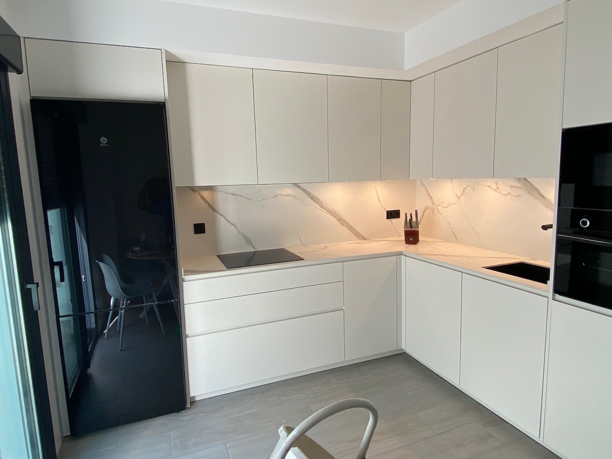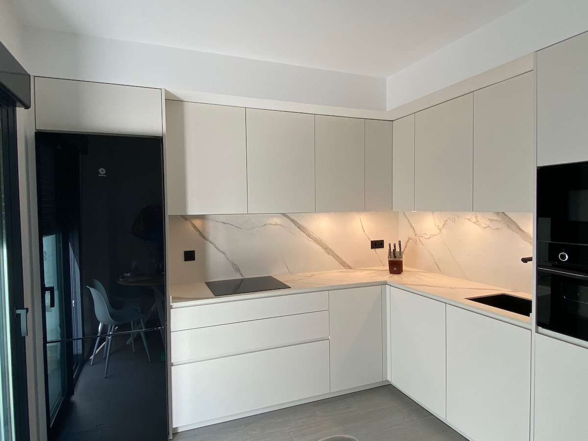 En esta ocasión, nos hemos desplazado a La Rinconada para realizar un trabajo muy especial de la mano de Baben Interiorismo. Este proyecto destaca por la combinación del color blanco latte en los muebles con una encimera porcelánica de INFINITY, modelo Extra Statuario Sat, que incluye un aplacado del mismo material. Este diseño consigue una continuidad de veta que se asemeja a la de las canteras naturales de cuarcita, aportando un toque de lujo y sofisticación.