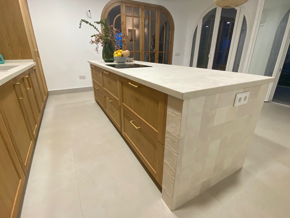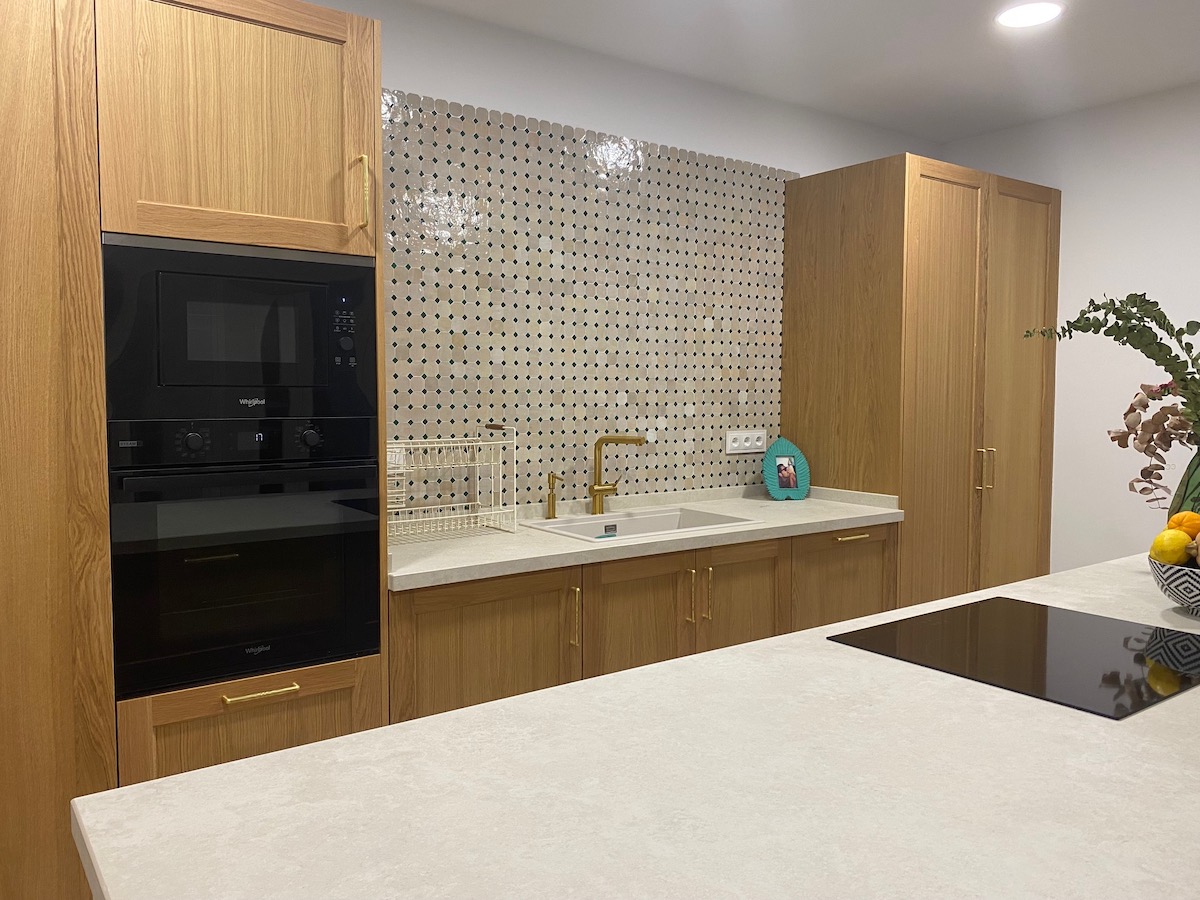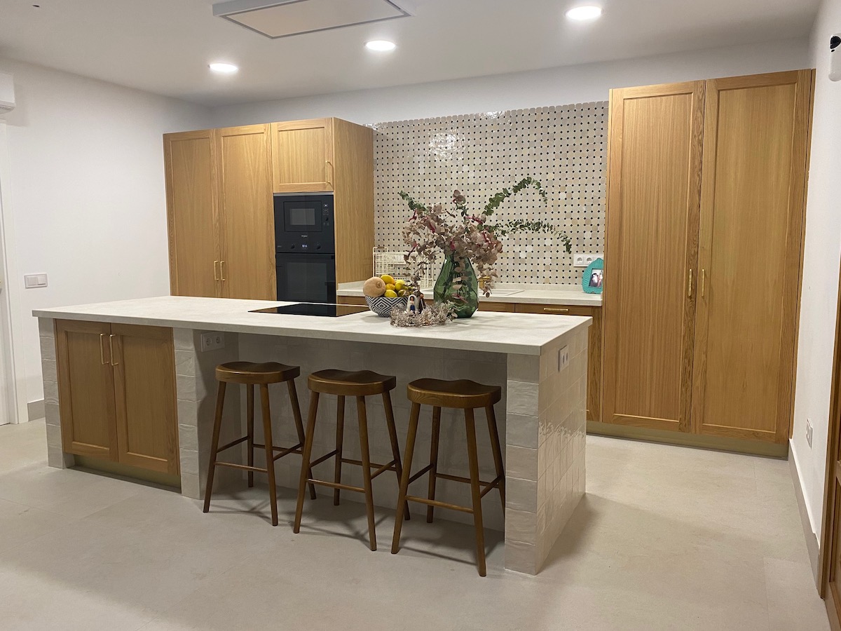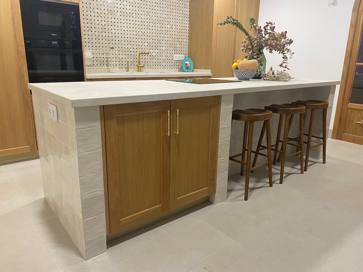 La protagonista de esta cocina atemporal en Mairena es la madera de roble, utilizada tanto en los muebles como en los detalles de la isla, aportando calidez y carácter al espacio. Esta madera, conocida por su durabilidad y belleza natural, se combina con azulejos artesanos que revisten tanto las paredes como la estructura de la isla, añadiendo textura y un toque artesanal que resalta en el diseño.