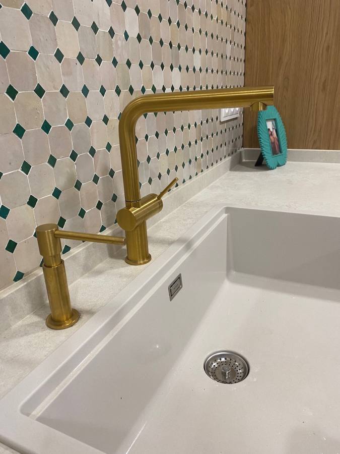 Los acabados dorados, presentes en los tiradores y grifería, aportan un toque de sofisticación que contrasta a la perfección con los electrodomésticos en negro. Esta combinación de elementos clásicos y contemporáneos logra un equilibrio visual que hace que esta cocina sea tan funcional como elegante.