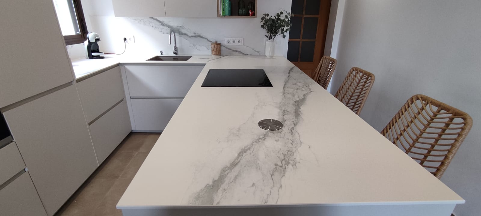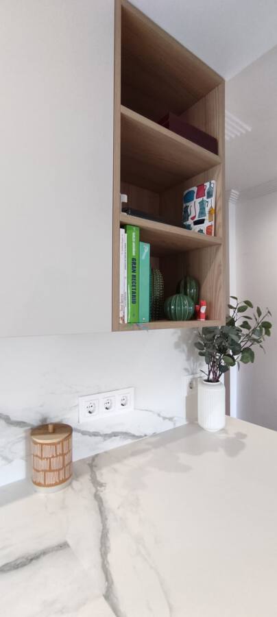 La estancia se complementa con la encimera de porcelánico veteado en un color muy cálido que ayuda
