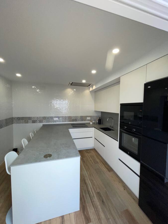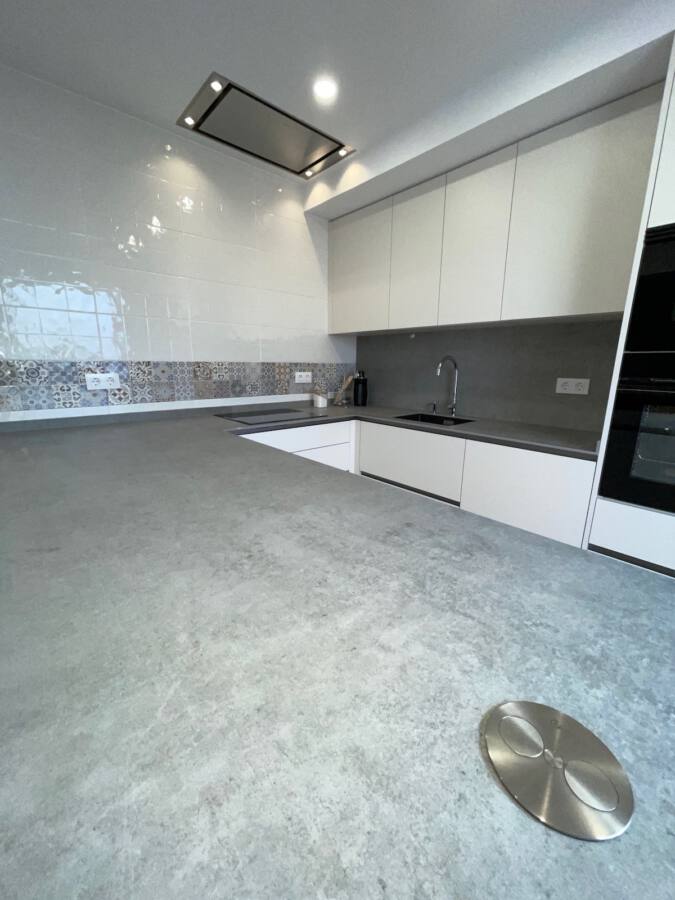 Esta espectacular cocina con campana de techo es de color blanco pero incluye golas en color titanio que van a juego con la encimera porcelánica Dekton Kreta.