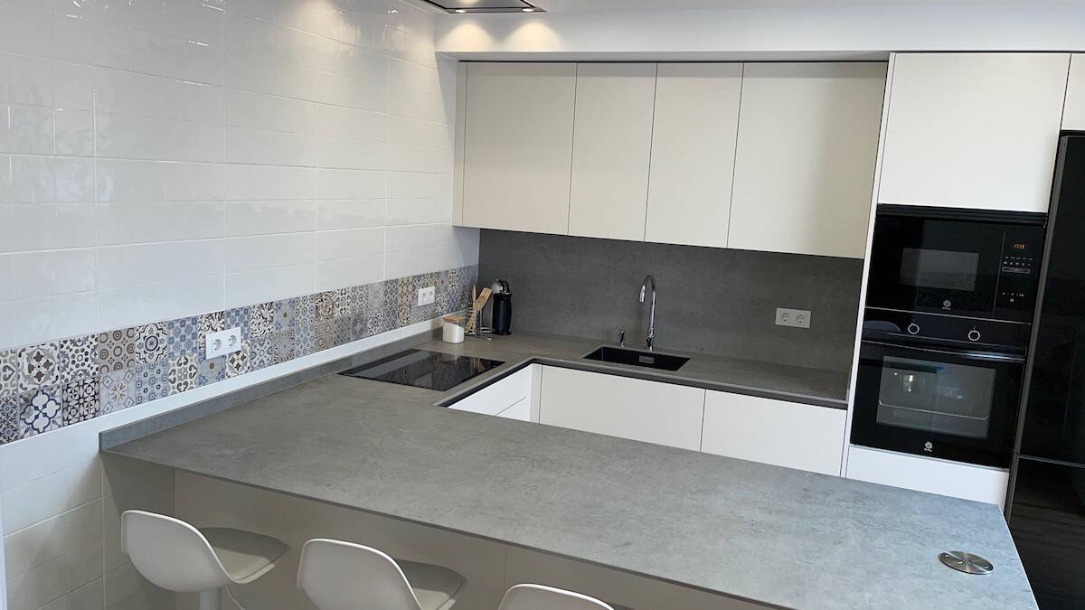 La zona de aguas incluye un aplacado que alcanza hasta los muebles altos. Estos dan continuidad al mueble columna que aloja los electrodomésticos de la cocina. El resto de la estancia está cubierta por azulejos en las paredes, con una cenefa con figuras geométricas en la zona inerior.