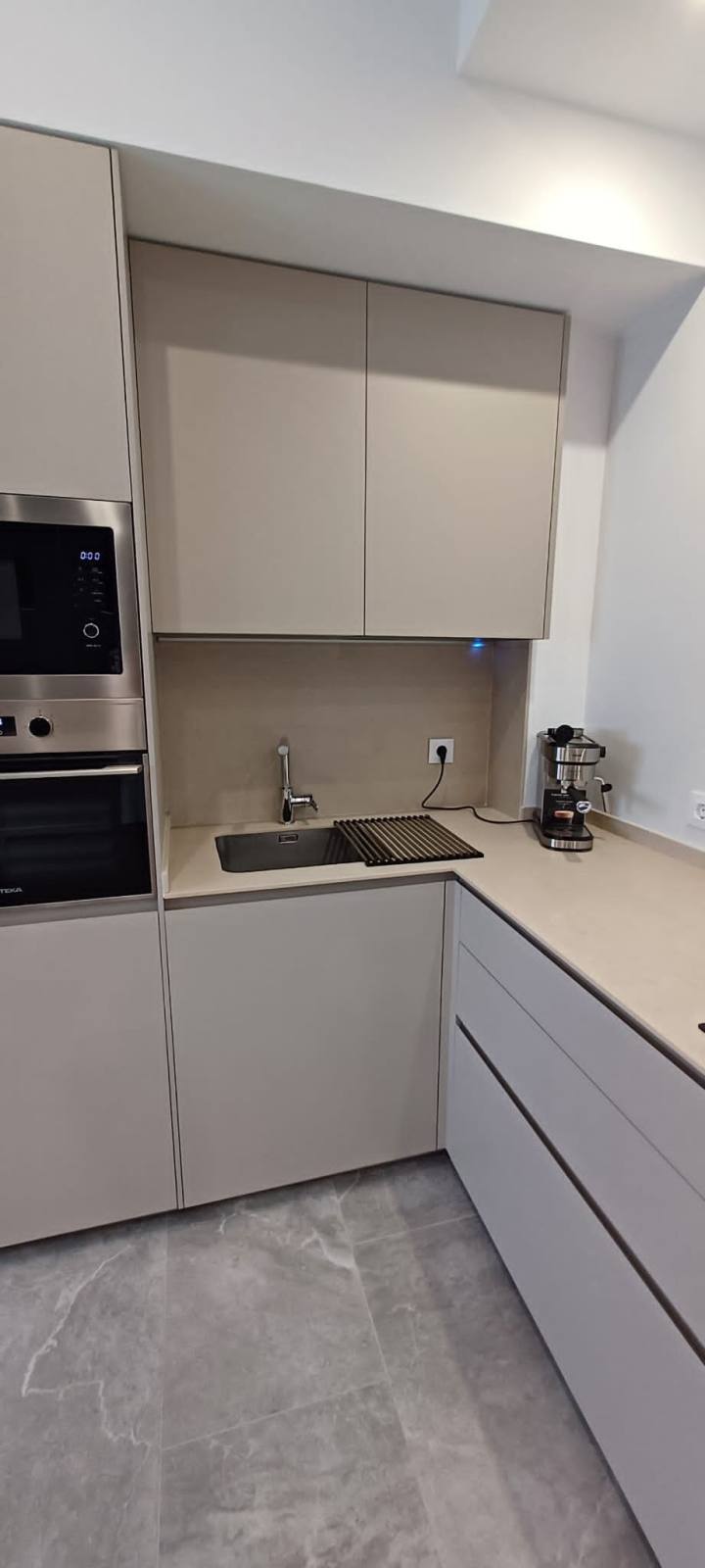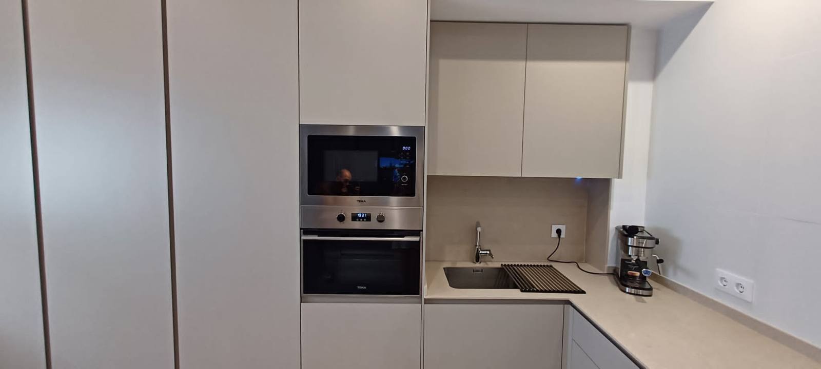 Además de su diseño vanguardista, esta cocina cuenta con una disposición inteligente de los electrodomésticos. El horno compacto de 45 cm se encuentra estratégicamente ubicado sobre el lavavajillas integrado, maximizando así la eficiencia del espacio y facilitando la tarea de cocinar y limpiar. Los electrodomésticos de marcas de renombre como Teka y Electrolux garantizan un rendimiento de alta calidad en cada uso.