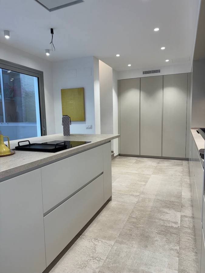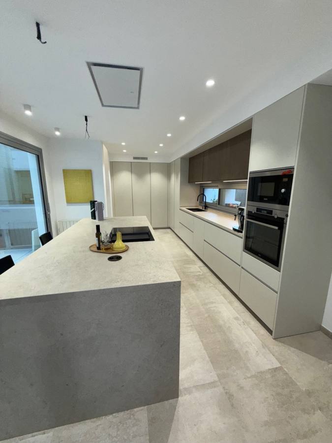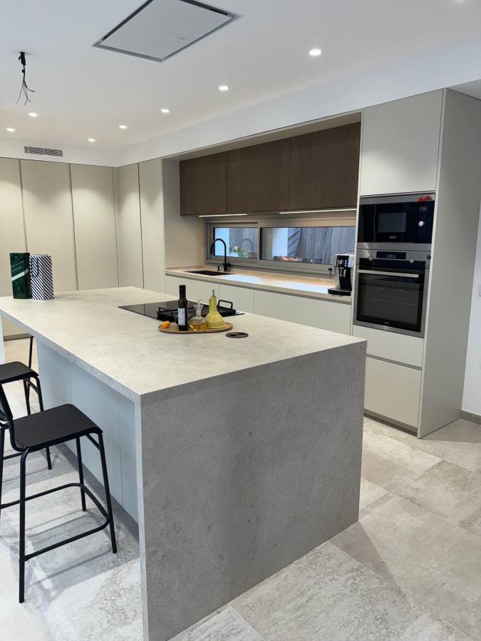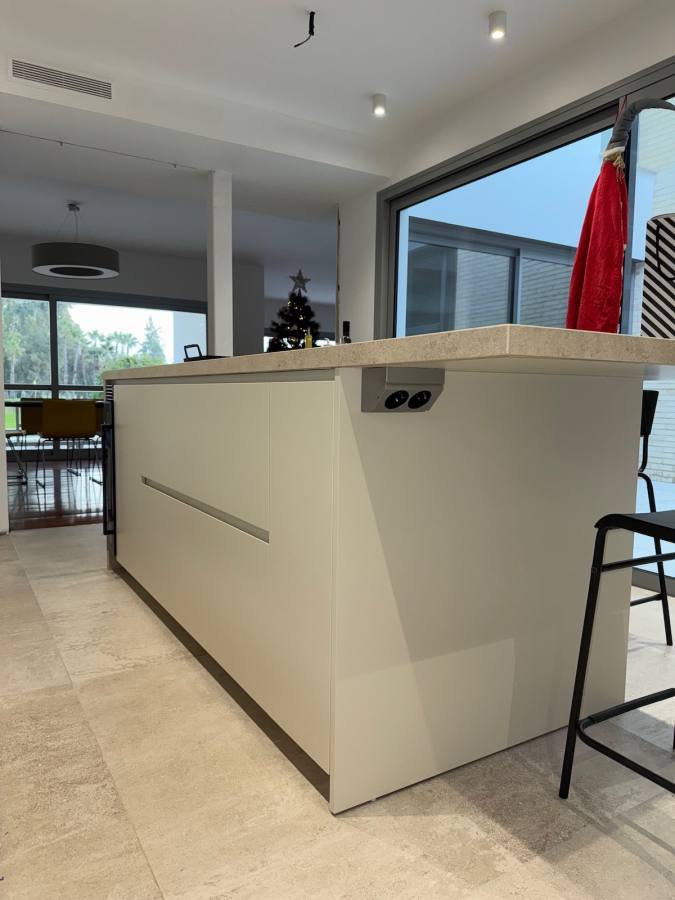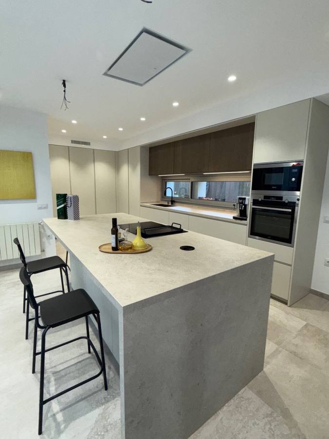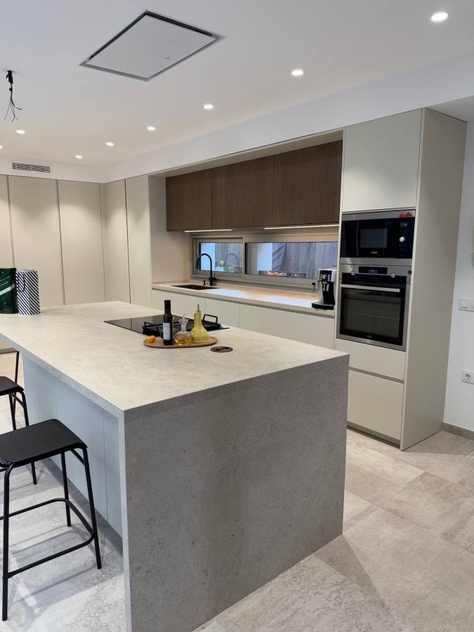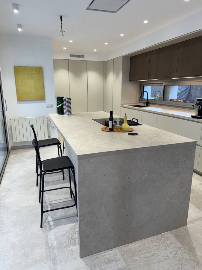 En Cocinova, estamos orgullosos de haber creado esta cocina con encimera abujardada instalada en Sevilla. Este proyecto combina un diseño contemporáneo con materiales de alta calidad, logrando un espacio acogedor y funcional que se adapta perfectamente al día a día de sus propietarios.