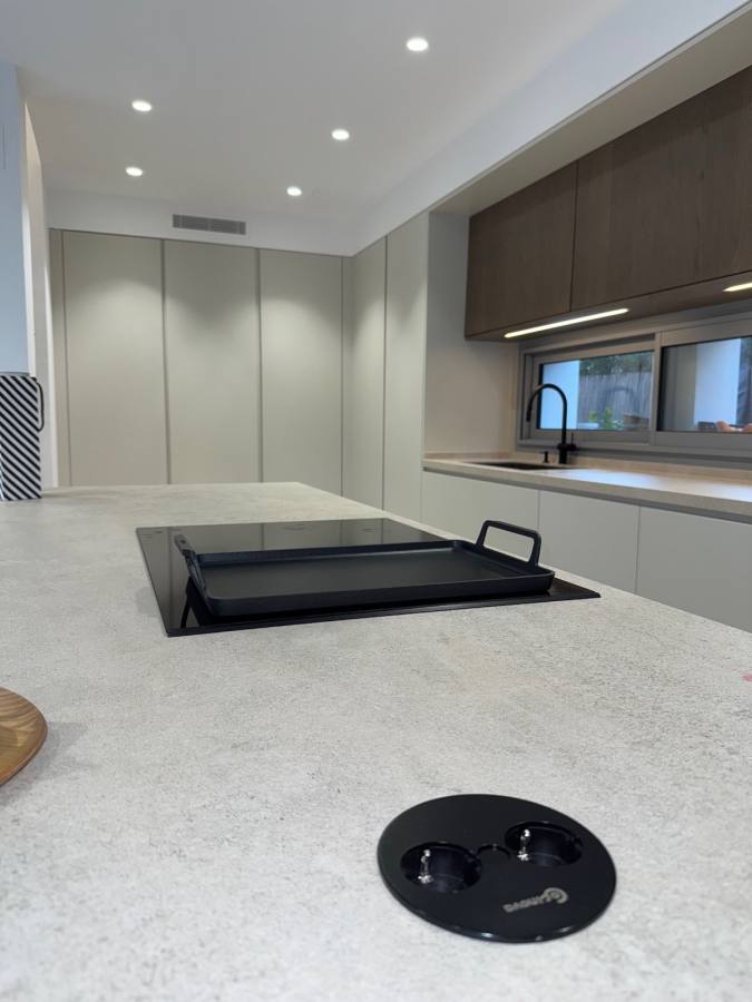 La elección de materiales ha sido clave para conseguir un resultado único. La encimera abujardada, con su textura y acabado distintivo, aporta una estética elegante y natural que se integra armoniosamente con el resto de elementos. Por otro lado, la combinación de madera natural de roble y muebles lacados en tonos neutros crea un ambiente cálido y equilibrado, ideal para disfrutar en familia o con amigos.