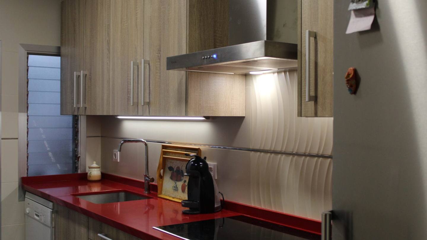 Una cocina con encimera roja es lo más llamativo de la cocina que os traemos hoy. La cocina pertenece a nuestros amigos Nicolás Cabello y Esperanza, un matrimonio que acudió a nuestra tienda por la recomendación de su hija, que anteriormente había sido clienta nuestra y cuyo resultado y satisfacción saltan a plena vista.