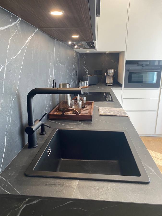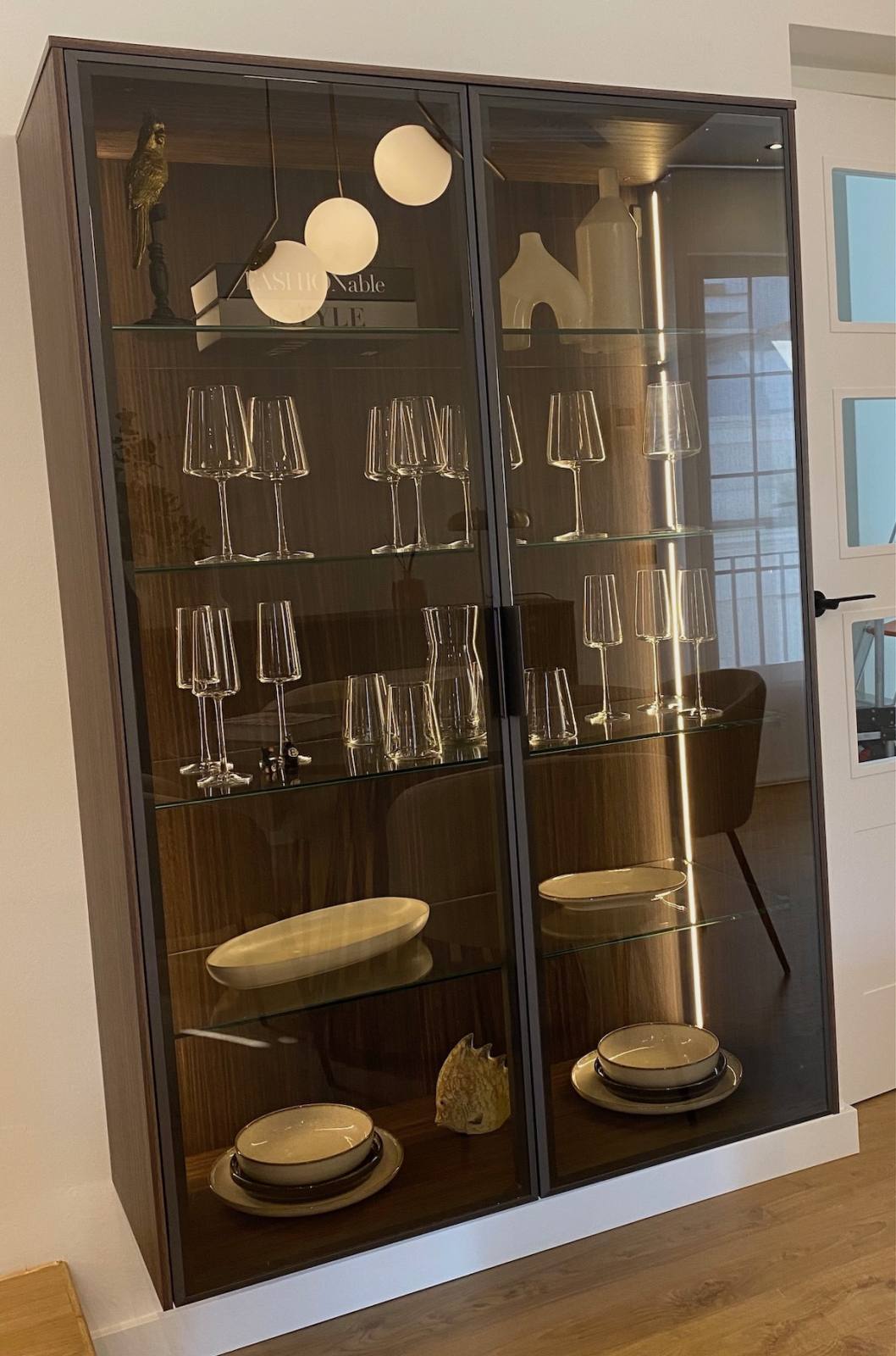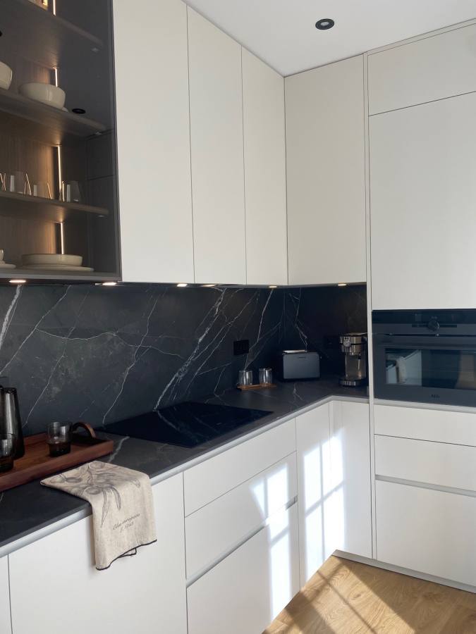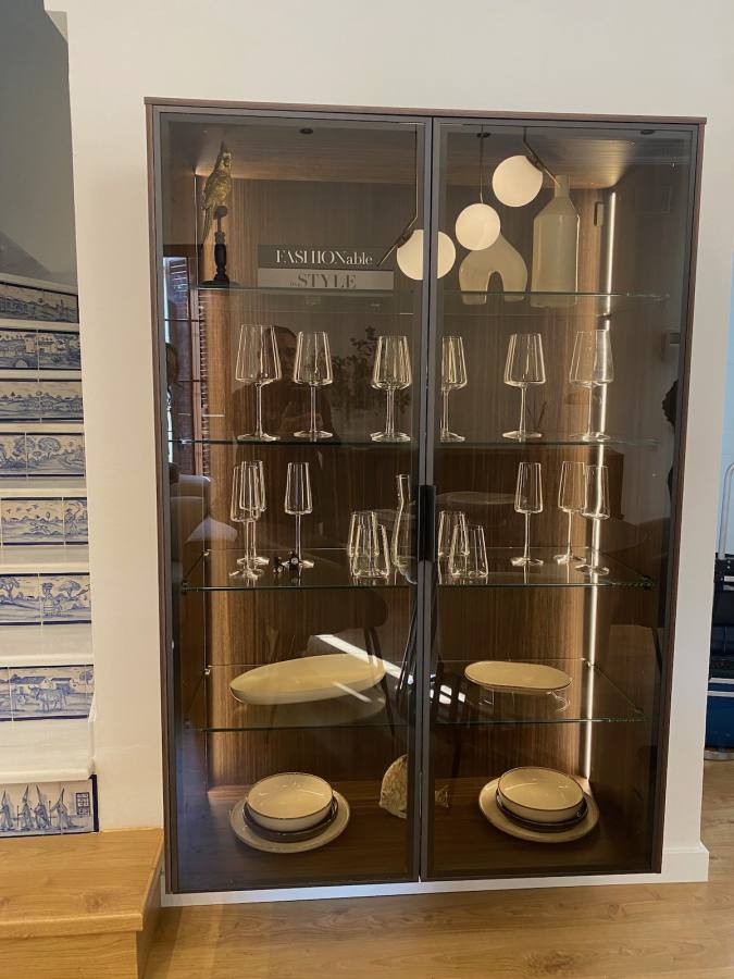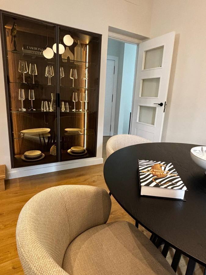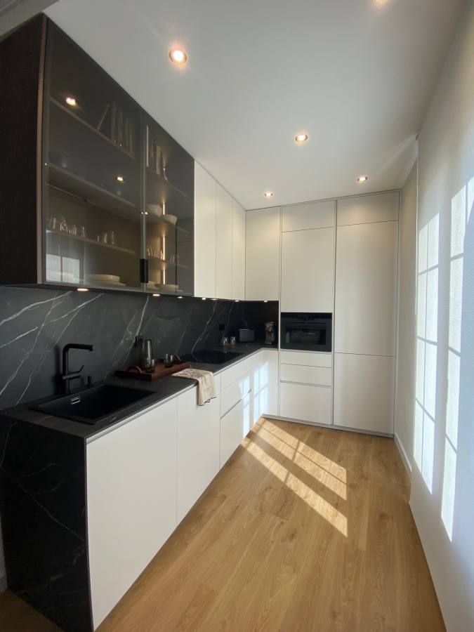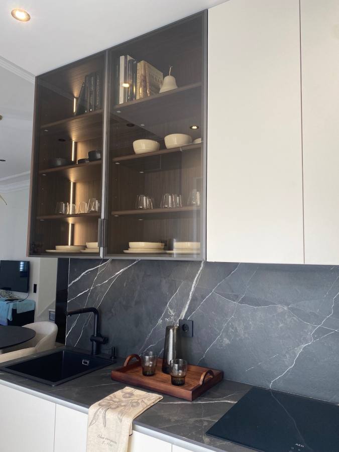 La cocina con laminado blanco no solo aporta luminosidad, sino que también maximiza la funcionalidad. Incluye vitrinas Less en grafito con cristal bronce, equipadas con iluminación LED interior que resalta cada detalle. Las baldas de cristal templado, el interior en eucalipto fumé y los costados a juego añaden un toque de distinción. Además, la encimera de Laminam en modelo Diamond Calacatta Black Bocciardato ofrece una superficie resistente y elegante, ideal para el día a día.