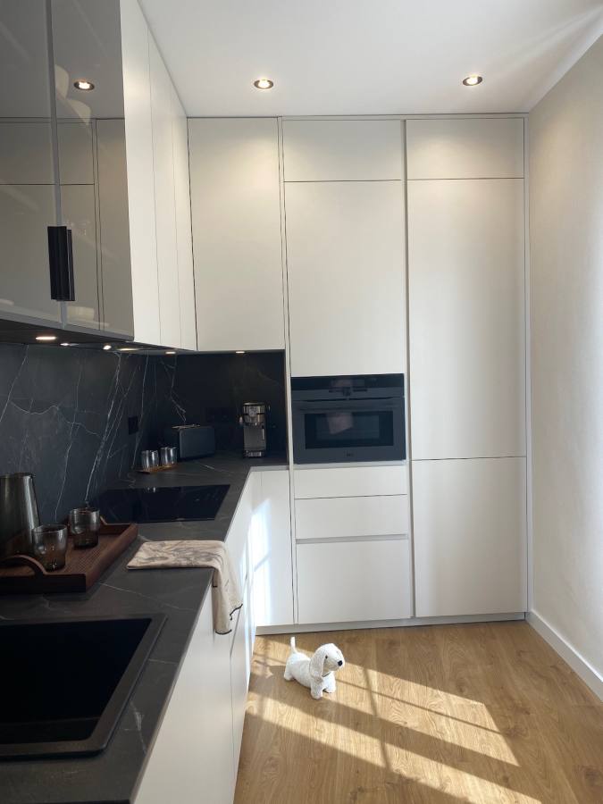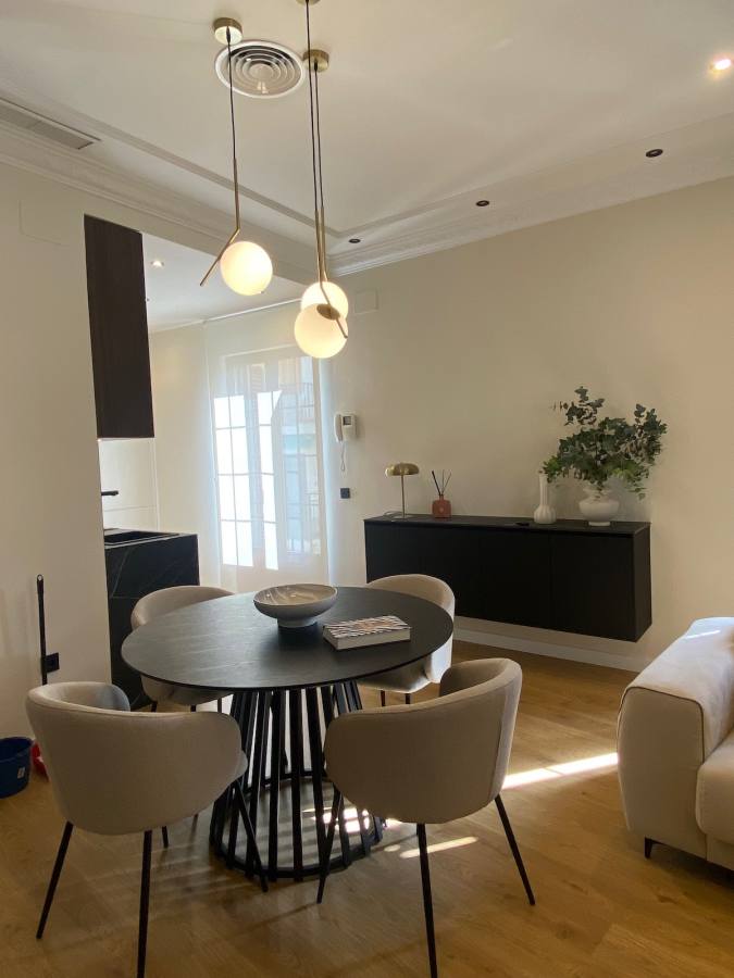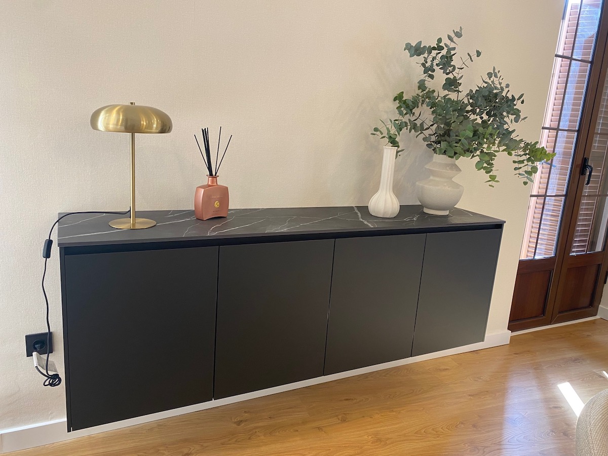 Este proyecto va más allá de la cocina: se extiende al salón con muebles a medida, una mesa, estanterías de librería y una vitrina decorativa que complementan el conjunto. La cocina con laminado blanco se convierte en el corazón de la estancia, conectando visualmente con el salón en Fénix negro para crear un ambiente sofisticado y acogedor. Es una propuesta que equilibra diseño y versatilidad, perfecta para quienes buscan un hogar con personalidad.