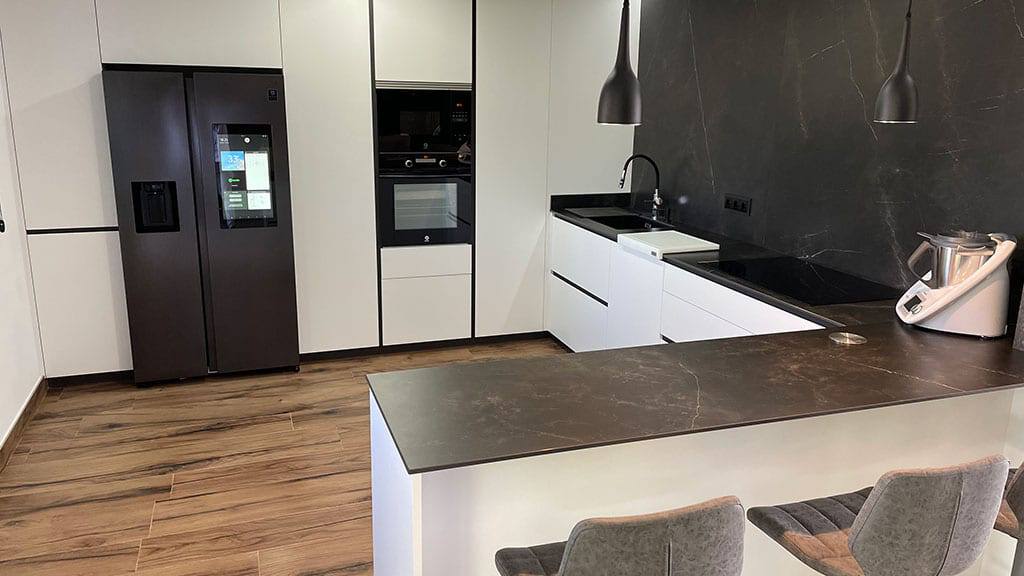 Entrando de lleno en el proyecto, se trata de una cocina Dica en color Blanco polar que se combina con una encimera porcelánica de Inalco, correspondiente a la serie Storm, y que se completa con un aplacado muy llamativo en el mismo material.