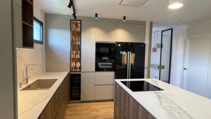 Se trata de una cocina abierta del fabricante Dica, y que integra a la perfección la cocina con el salón. En ella hemos combinado colores y materiales, como la madera olmo y el color nude de los muebles, con una encimera porcelánica con unas vetas impresionantes. Ambos costados de la isla llegan al suelo, consiguiendo así una integración perfecta entre las dos estancias.