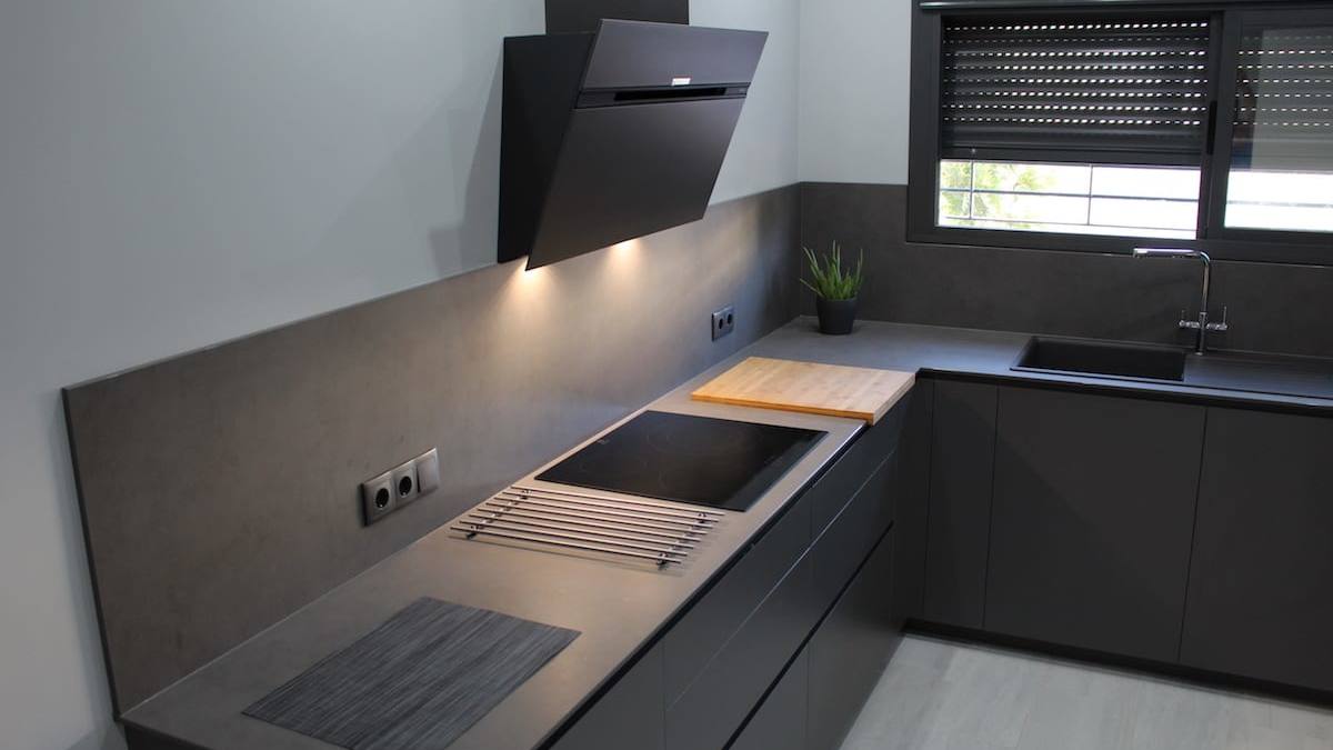 Es una cocina Dica instalada en Mairena del Alcor, modelo Milano 45 en color gris volcano con altura de 85 centímetros. La cocina se asocia a la perfección con una encimera Neolith en la misma tonalidad que el mueble.