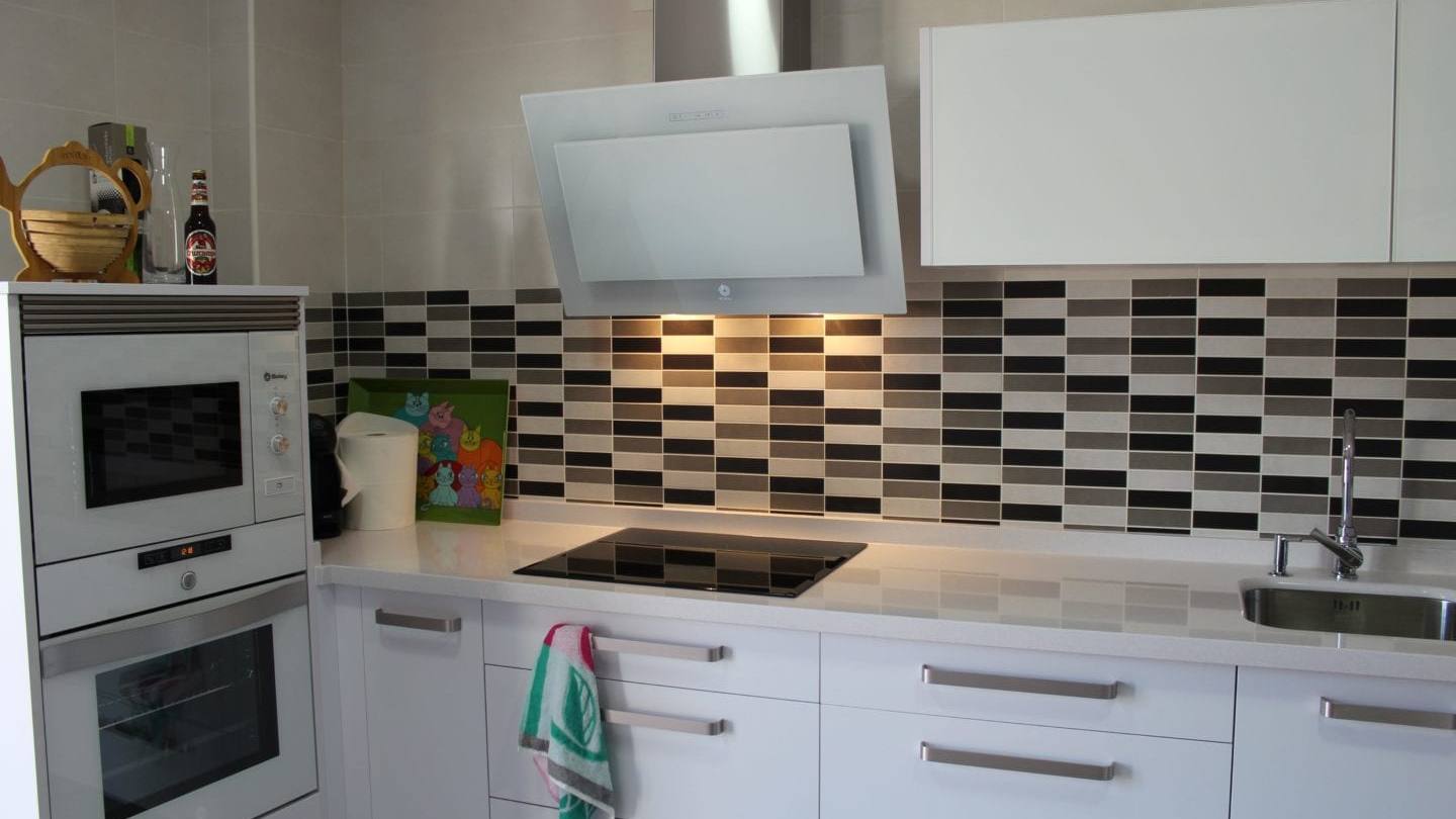 El toque de color a la cocina se lo da la amplia cenefa con colores blanco, gris y negro que cubre desde la encimera hasta prácticamente los muebles altos y que alcanza la misma altura que el horno y el microondas.
