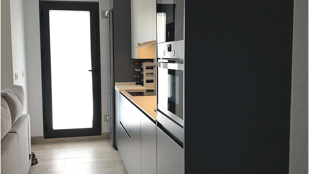 La cocina tiene una disposición lineal, ocupando solo un frente de la estancia. Basta con un único fondo de pared para instalar todos los elementos. De manera contigua a esta cocina en la playa aparece el salón, que es de la línea de hogar de Dica y combina el blanco de los muebles suspendidos y una vitrina en color Bronce con cristales fumé con luz interior led.