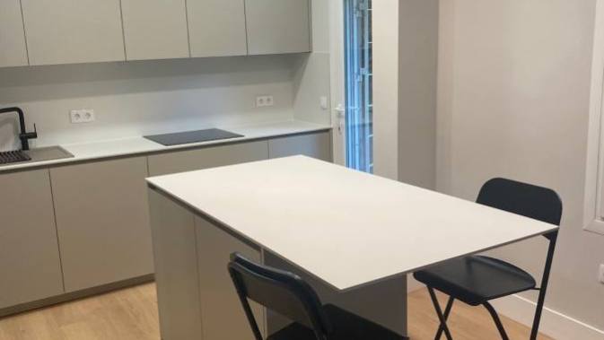 El mobiliario alto y bajo, junto con las columnas, proporciona una gran capacidad de almacenamiento, manteniendo todos los utensilios y electrodomésticos bien organizados. La integración de hornos, electrodomésticos y espacios de trabajo está pensada para facilitar la movilidad y optimizar cada rincón. En la isla, además de servir como superficie de trabajo, se ha añadido una zona para comer con taburetes altos, perfecta para desayunos o comidas informales.