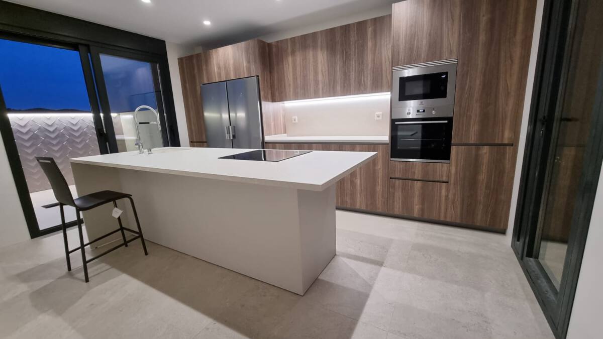 Esta espectacular cocina en Martín de la Jara goza también de una iluminación óptima para hacer resaltar todos los detalles de la madera y la encimera. A su vez, la iluminación artificial, con apliques de techo y tiras led en la zona del aplacado, aportan un toque muy sofisticado y cálido que anima a pasar tiempo en la estancia.