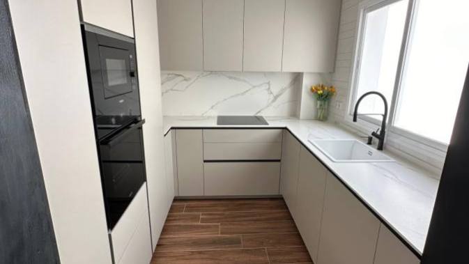 La cocina elegida es el modelo DICA en un elegante color Nude, que aporta calidez y luminosidad a todo el ambiente. La encimera porcelánica Infinity Calacatta Oro Sat añade un toque sofisticado, mientras que los detalles en Gris Noche de las golas y zócalos ofrecen un contraste ideal. Además, la zona de aguas ha sido decorada con elementos en negro, creando una armonía perfecta entre todos los elementos.