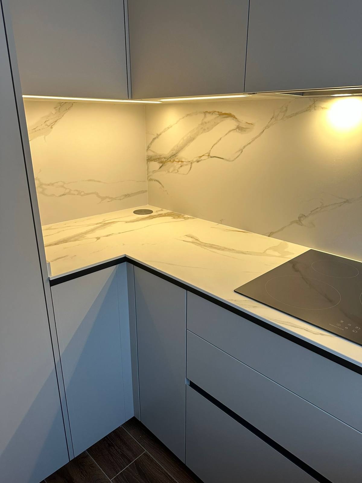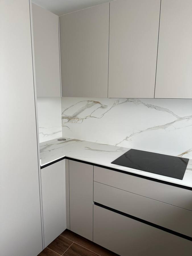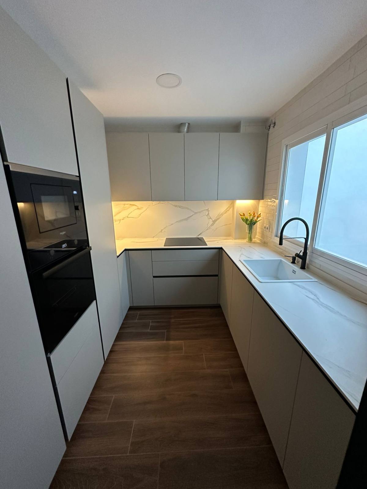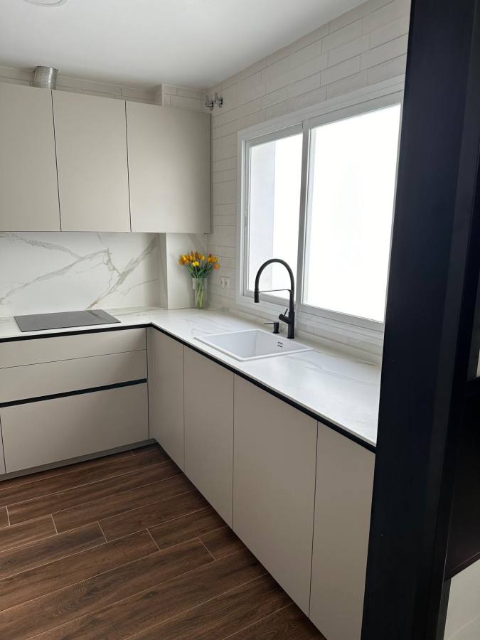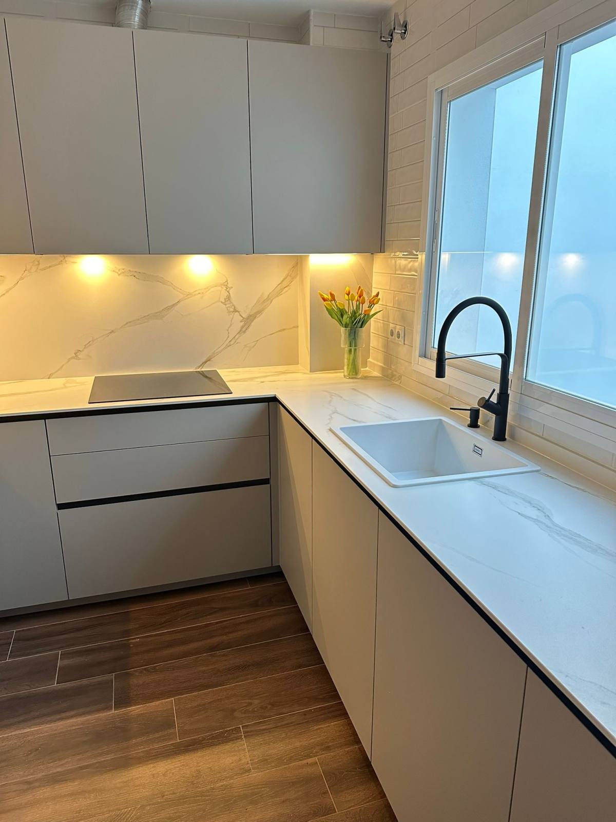 La cocina elegida es el modelo DICA en un elegante color Nude, que aporta calidez y luminosidad a todo el ambiente. La encimera porcelánica Infinity Calacatta Oro Sat añade un toque sofisticado, mientras que los detalles en Gris Noche de las golas y zócalos ofrecen un contraste ideal. Además, la zona de aguas ha sido decorada con elementos en negro, creando una armonía perfecta entre todos los elementos.