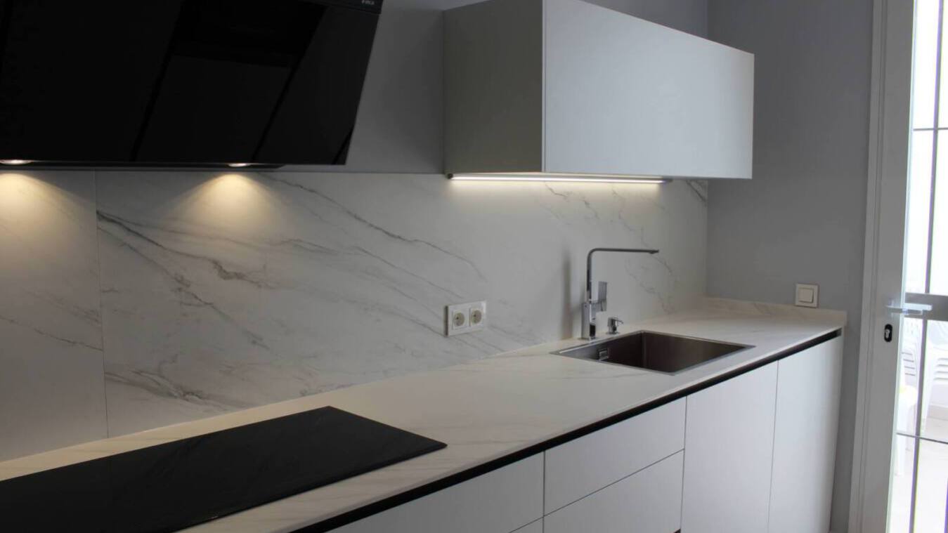 La cocina es de Dica, modelo Milano en color Blanco Polar. Junto a ella apareece una encimera porcelánica de Inalco en color Touché Ice Blanco y canto simple muy a juego con toda la estancia. El equipamiento se completa con campana Elica Stripe de 90 en color negro y electrodomésticos Electrolux.