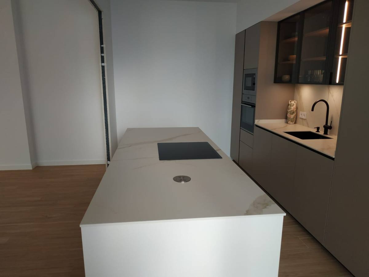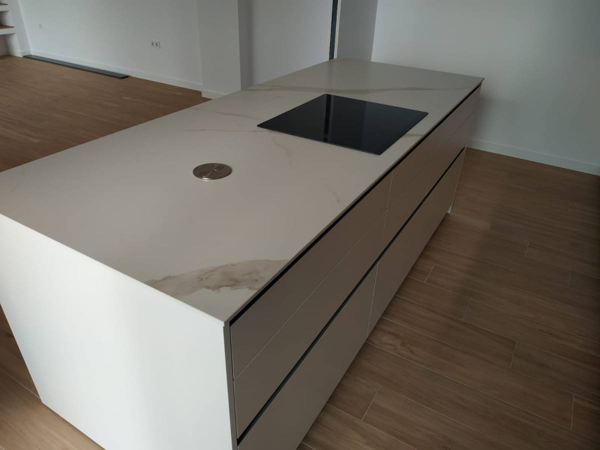 La encimera porcelánica, del modelo Calacatta oro venato soft de Laminam, es simplemente impresionante. Su apariencia elegante y su suave vetado aportan un toque de lujo a todo el espacio. La zona de aguas, con su fregadero SCHOCK en un audaz color negro, agrega un elemento distintivo al ambiente general. Combinado con la placa de cristal negro, crea un contraste fascinante que resalta la belleza de la encimera.