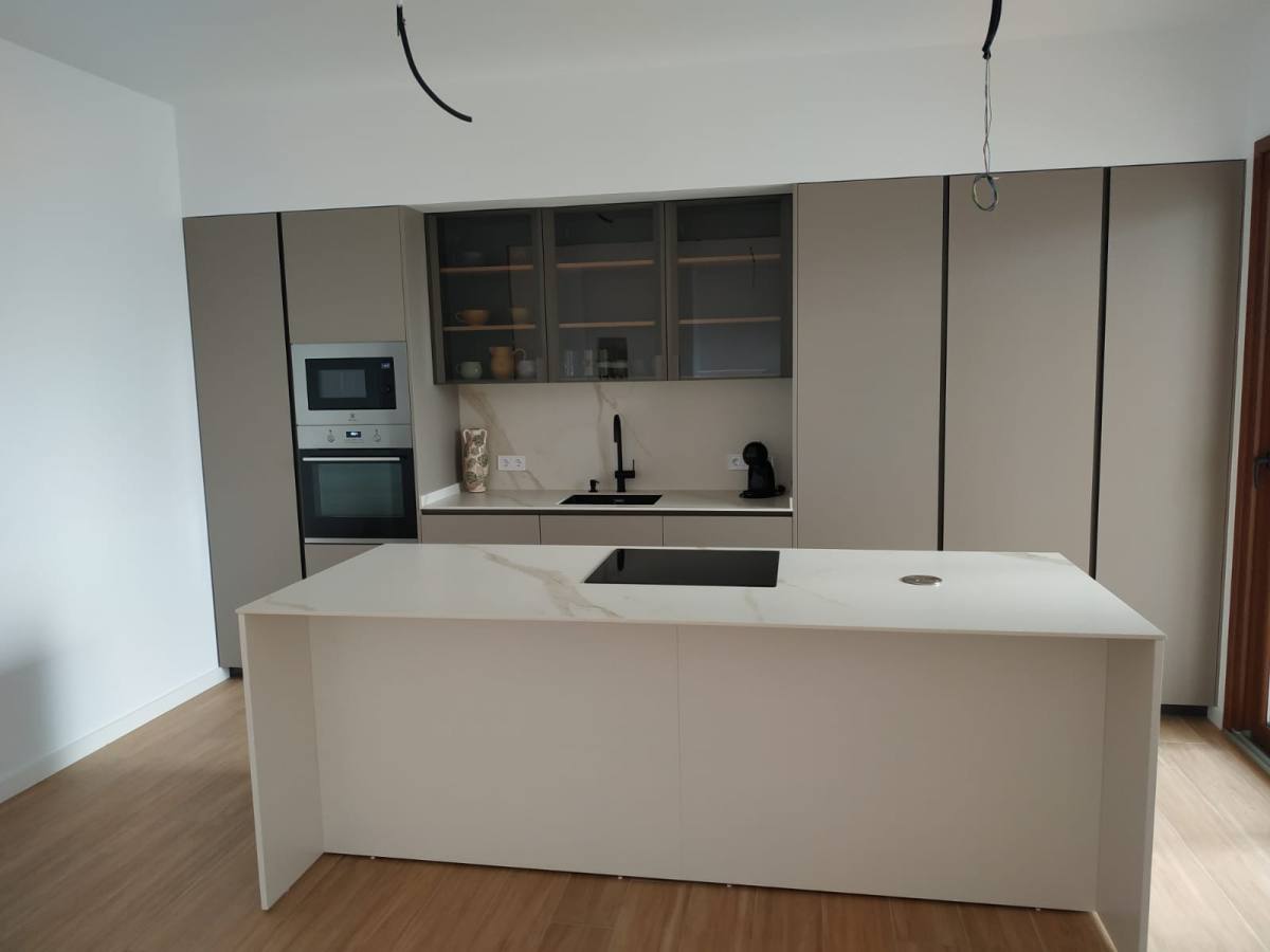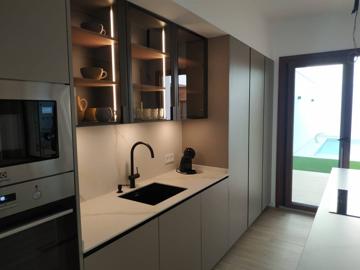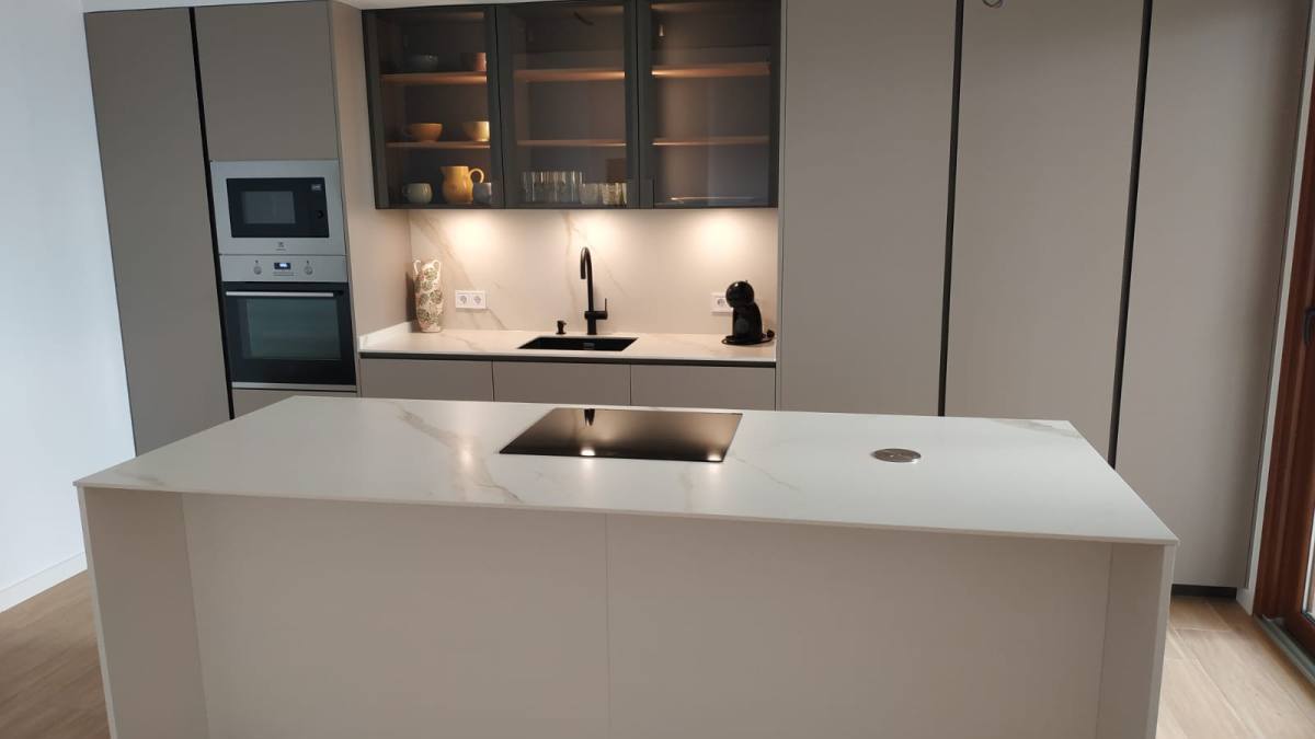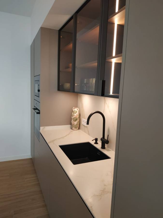 La cocina, fabricada en el modelo Milano 45, presenta un hermoso color Piedra MI que se combina a la perfección con golas y zócalos en un rico tono de bronce. Pero lo que realmente llama la atención desde una perspectiva decorativa son las vitrinas altas en la zona central. Estas vitrinas cuentan con cristal bronce y una iluminación vertical integrada en su interior, además de un foco led exterior que añade un toque de sofisticación.