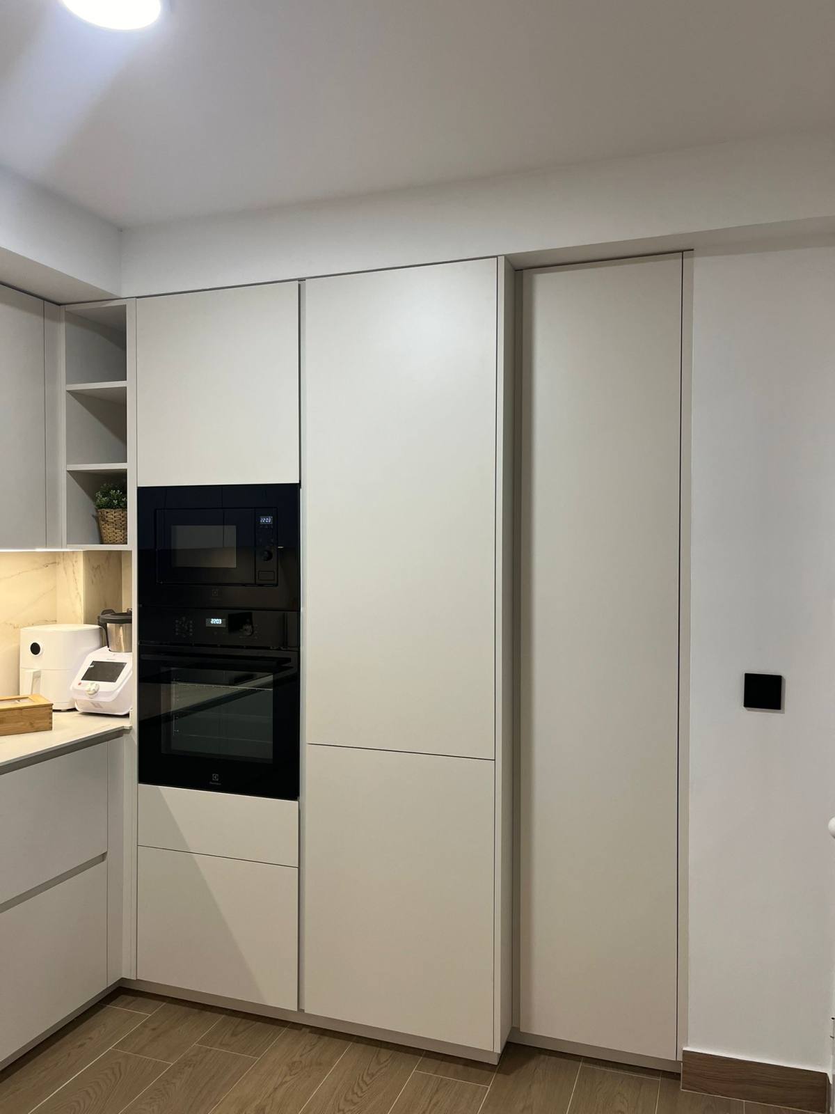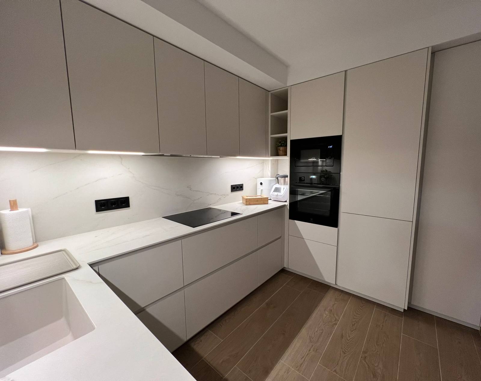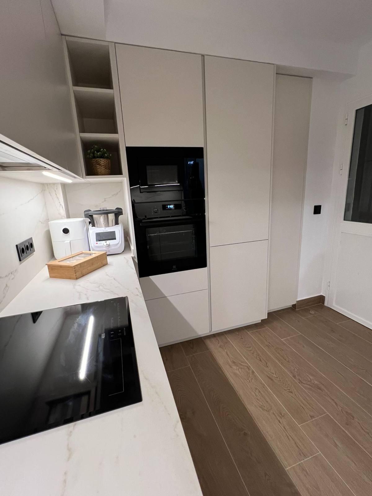 Uno de los aspectos más destacados de esta cocina instalada en Marchena es el suelo en color madera de roble, que aporta calidez y equilibrio al diseño. Este tipo de suelo no solo es visualmente atractivo, sino que también es muy práctico para el día a día en una cocina, ofreciendo resistencia y durabilidad. Además, su tonalidad enriquece el ambiente, creando una sensación de amplitud y armonía en todo el espacio.