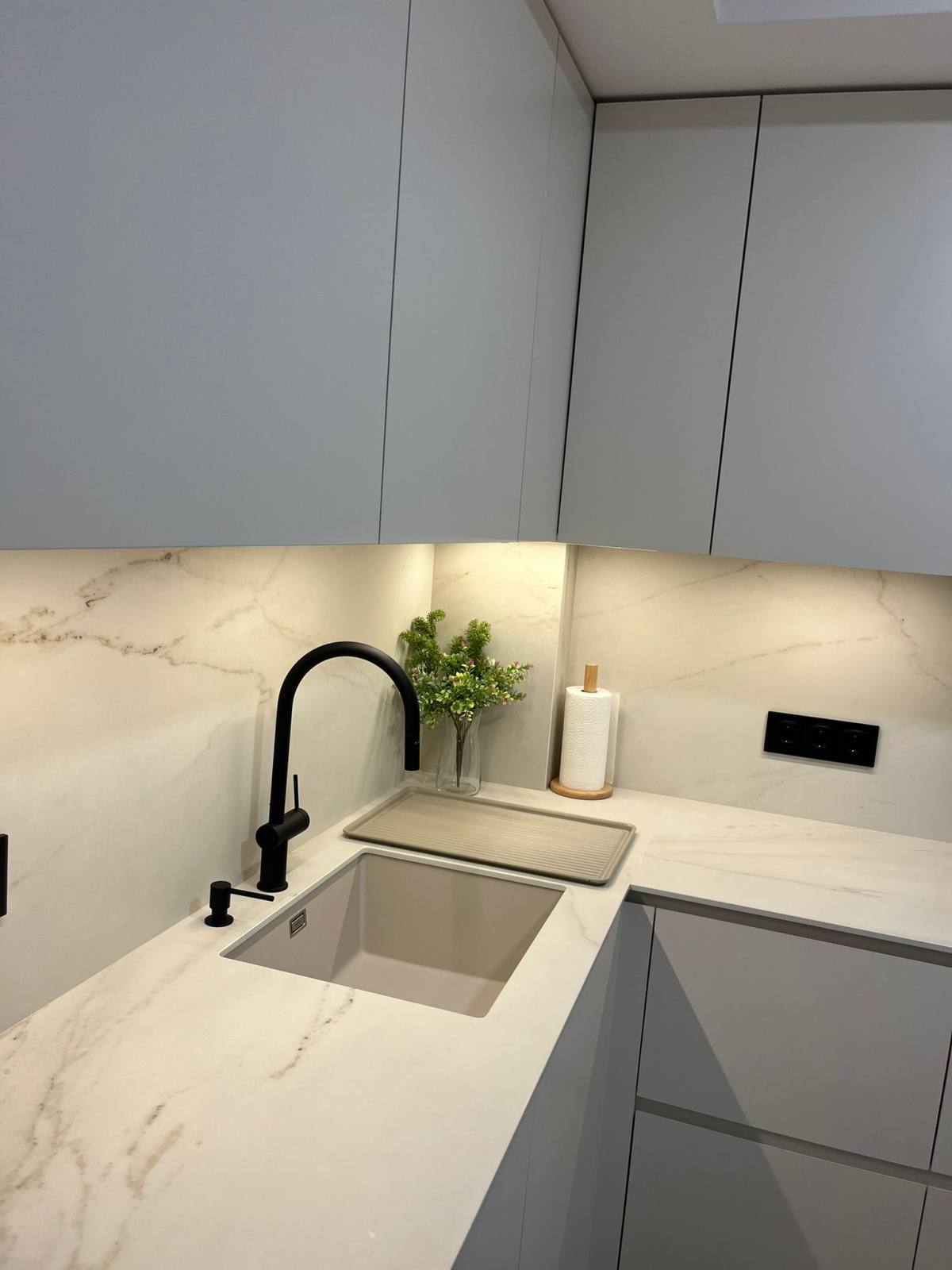 La cocina elegida es el modelo Milano 45 en el suave y cálido color Blanco Latte, una opción que aporta luminosidad al espacio y que, junto con la encimera porcelánica veteada de Dekton, modelo Rem, crea un contraste visual espectacular. La cocina instalada en Marchena se caracteriza no solo por la calidad de los materiales empleados, sino también por la combinación acertada de elementos decorativos. El uso de detalles en negro en la zona de cocción y la zona de aguas añade un toque de sofisticación y modernidad al conjunto, sin sacrificar la funcionalidad.