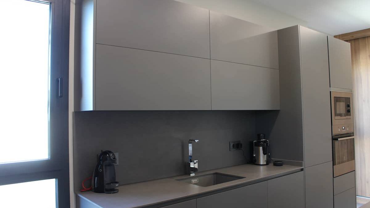 La estancia está presidida por la cocina Km0 Dica modelo Milano 45 en color gris Volcano. Se combina con una encimera porcelánica de 1,2 cm del mismo color en dos niveles y aplacado frontal. El resto del equipamiento lo conforman los electrodomésticos de Electrolux y la campana de techo Faber.