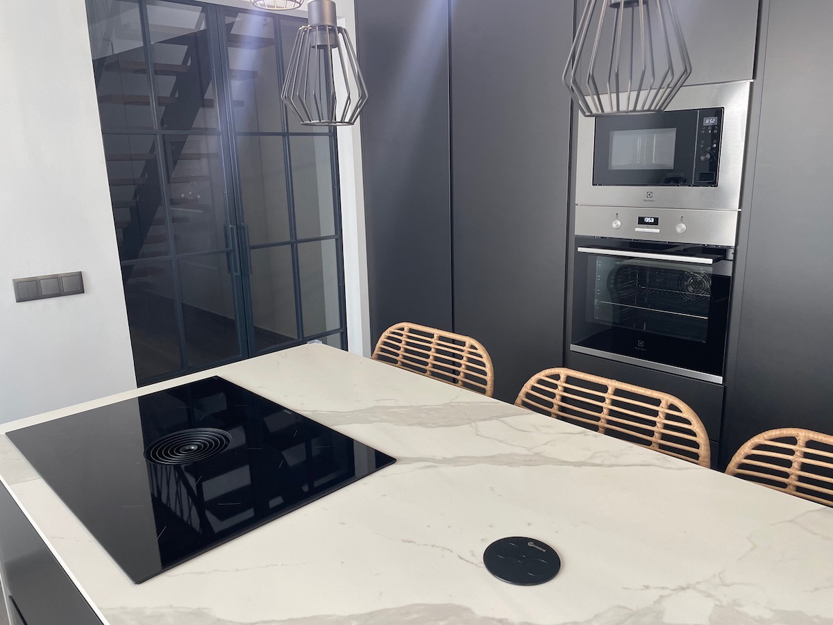 Una de las características más destacadas de esta cocina es la placa extractora Bora, que elimina la necesidad de una campana en el techo, manteniendo una estética limpia y moderna. Los electrodomésticos integrados, como los frigoríficos y el lavavajillas, se combinan a la perfección con el diseño general, proporcionando una apariencia uniforme y sofisticada.