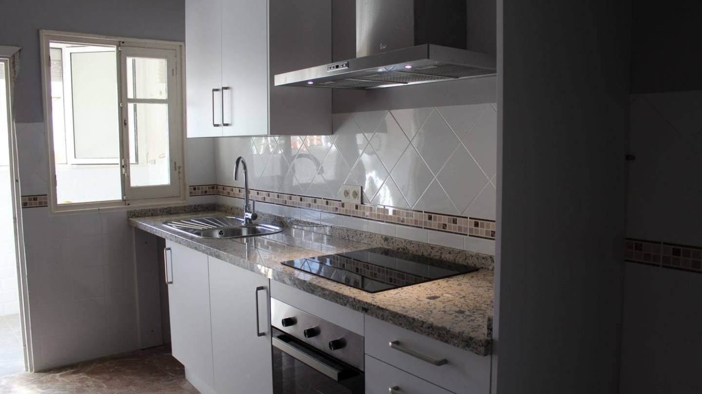 En la vivienda de Carmen Benot instalamos una cocina de gran calidad, resistente y a buen precio. En ella se combinan materiales como la formica en blanco brillo de los muebles y el granito nacional de la encimera. Dan buena demostración de que con poco se pueden obtener resultados enormes.