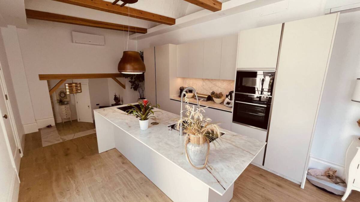 Esta cocina para una casa con historia está equipada con una amplia encimera porcelánica de Neolith, con fregadero blanco integrado en la misma encimera. Uno de los aspectos más destacables es la campana Elica suspendida en el techo y la hornacina frente a la isla. Los electrodomésticos son Electrolux, la grifería es de RGB y la zona de aguas es de Blanco.