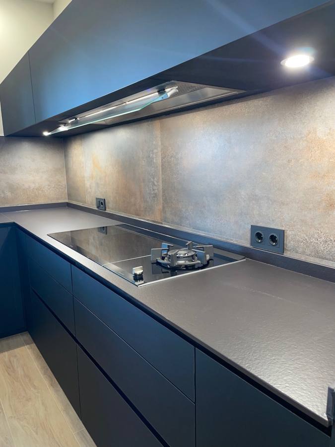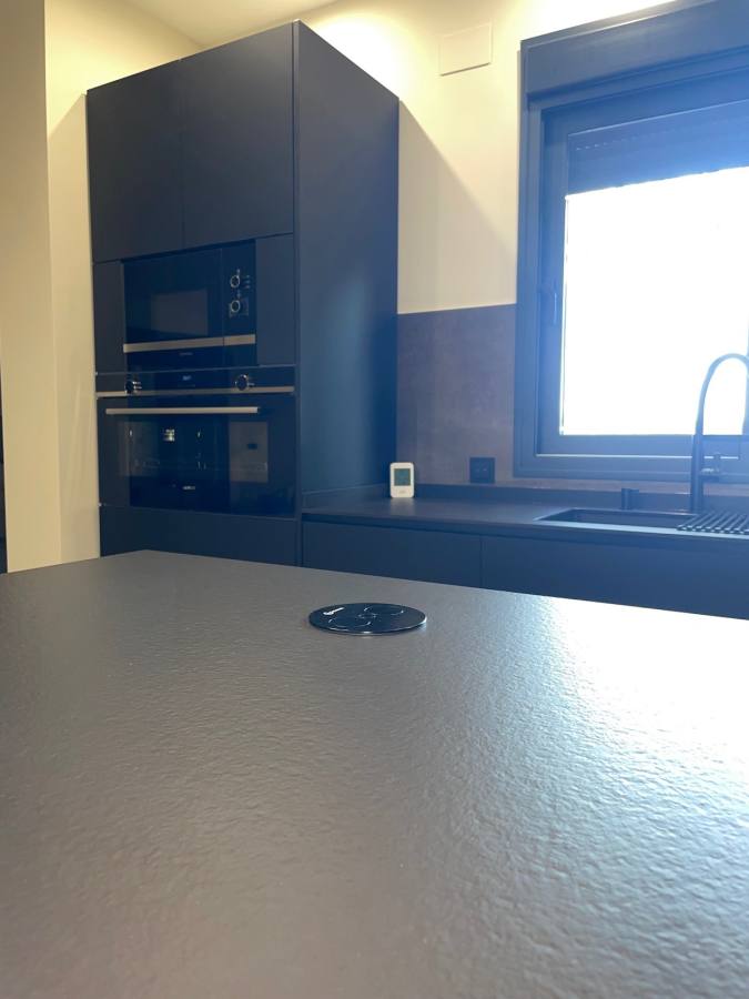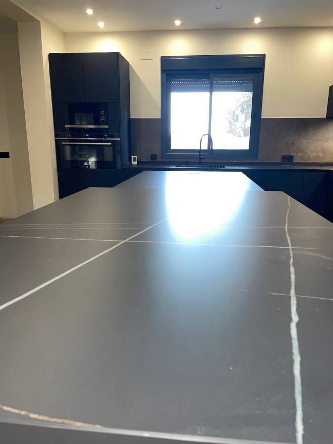 Uno de los aspectos más destacados de esta cocina perfecta son las encimeras. Hemos utilizado una encimera negra abujardada, conocida por su textura rugosa que añade un toque de sofisticación y modernidad. Además, hemos incluido una encimera superpuesta con vetas de la prestigiosa marca Inalco, que aporta un contraste visual y un toque de lujo al diseño general.