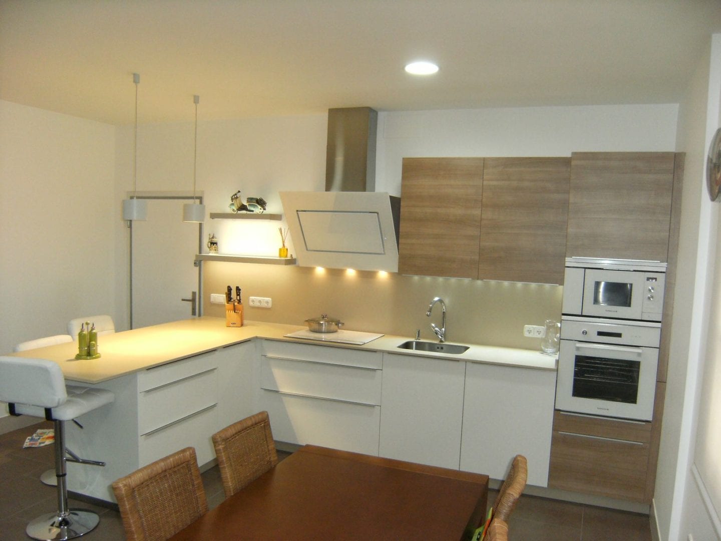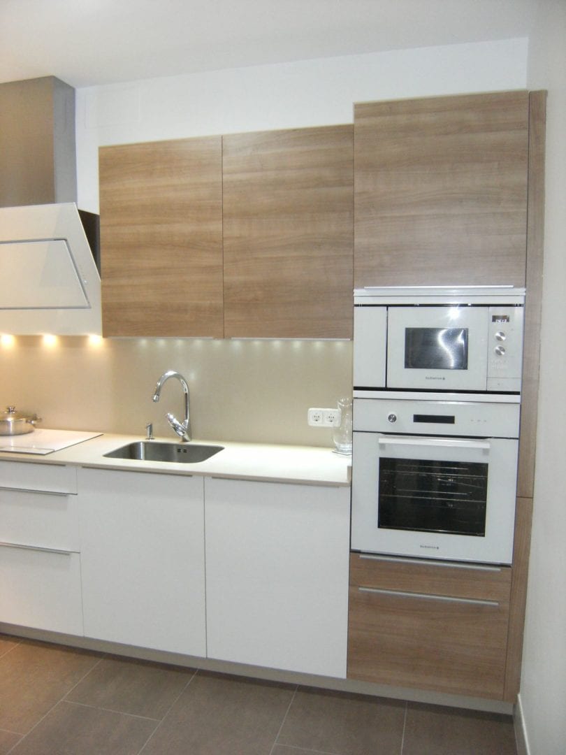 Para este proyecto eligieron una cocina Xey que combina el PVC en blanco y el laminado en nogal horizontal, los tiradores son de ancho variable en el canto de la puerta. Para la encimera nuestros amigos se decidieron por una encimera de la marca Techlam en su modelo Capuccino con canto de 2 cm y forrada por debajo.