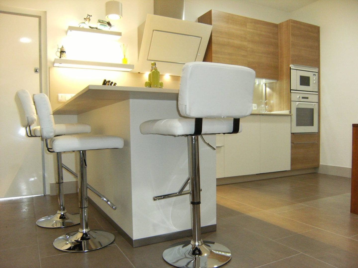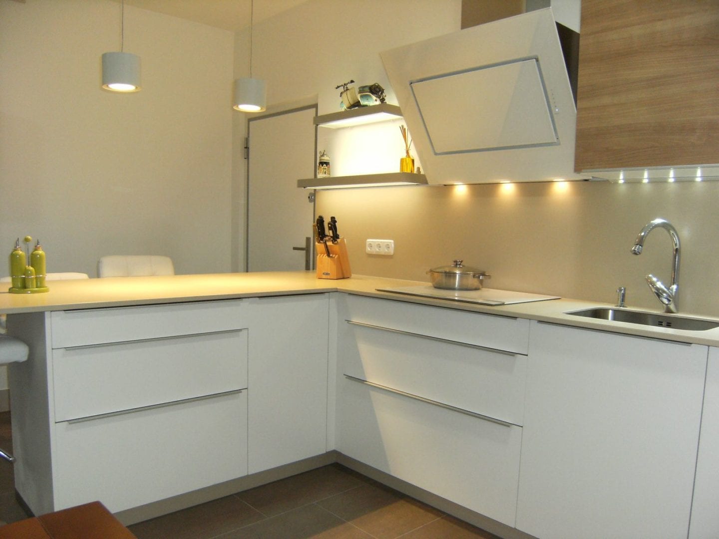 Una campana Quasar de Falmec, preside el centro de la cocina, acompañada por iluminación led y baldas luminosas de cocinova. En cuanto a electrodomésticos, le dieron el toque de calidad y diseño a su horno, micro, lavavajillas y placa de inducción, todos de la marca De Dietrich, que aúna la mejor calidad, con un color blanco que da el toque diferencial.