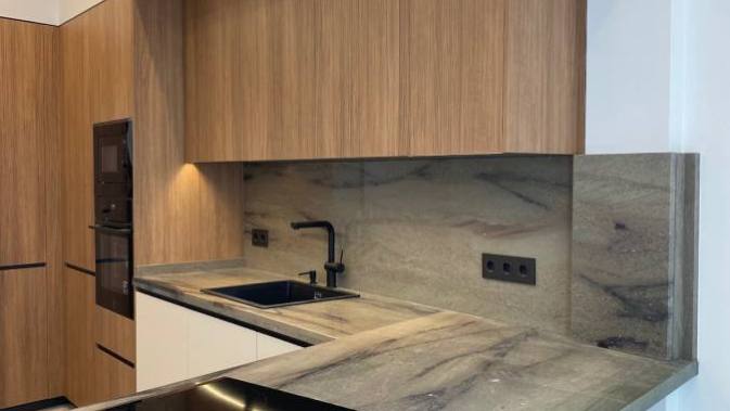 Gracias a su textura pulida y su gama cromática natural, esta encimera de granito se integra a la perfección con el resto del mobiliario, aportando elegancia y carácter al conjunto. Además, su fácil mantenimiento y su longevidad la hacen ideal para quienes desean una cocina funcional sin renunciar al diseño.