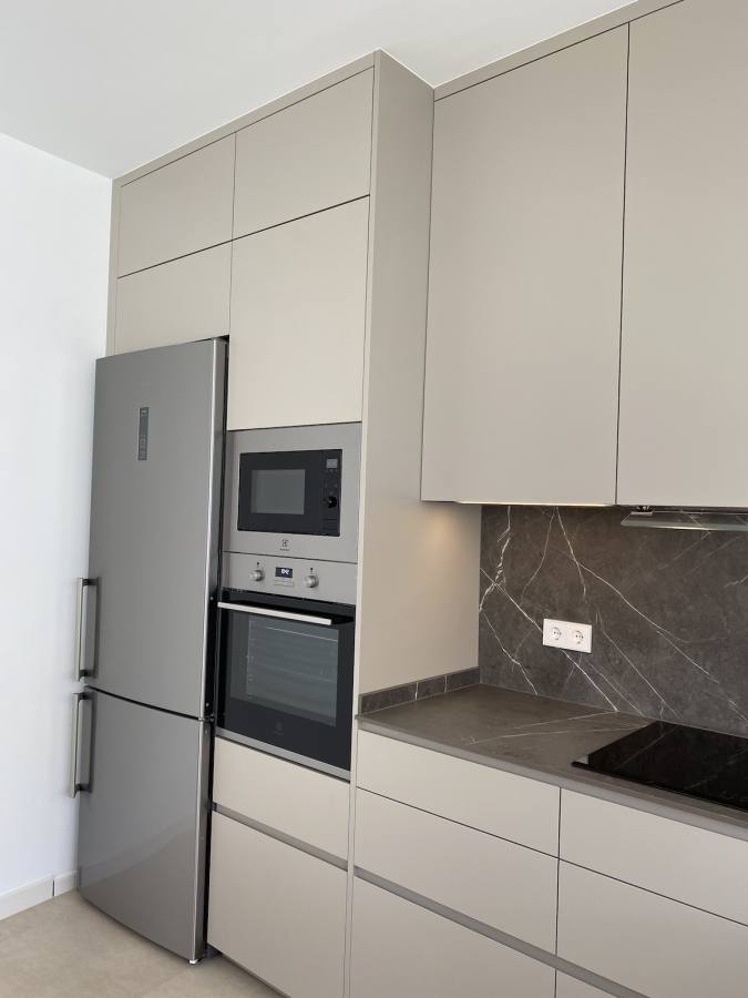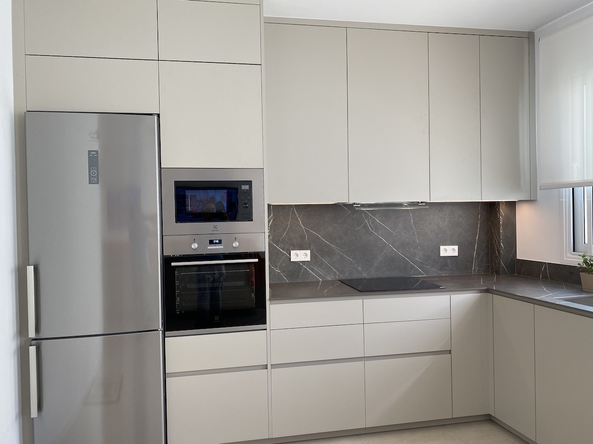 La selección de electrodomésticos completa la funcionalidad de esta cocina. Los electrodomésticos de las marcas Frecan, Balay y Electrolux aportan una excelente calidad y eficiencia, armonizando con el diseño general de la estancia. Estos elementos, junto con la encimera Infinity, hacen de esta cocina un espacio ideal para la preparación de comidas y la socialización.