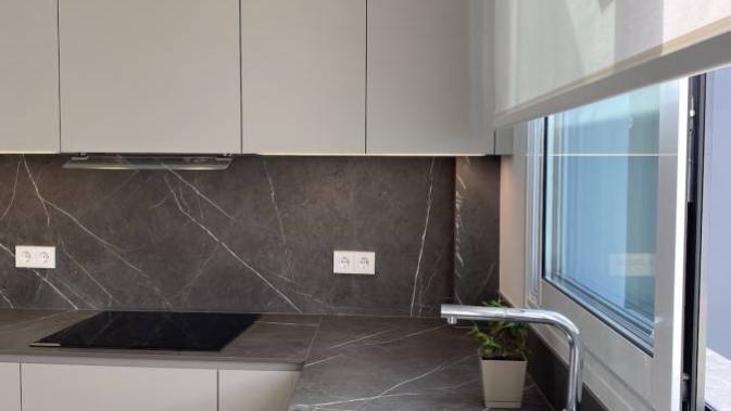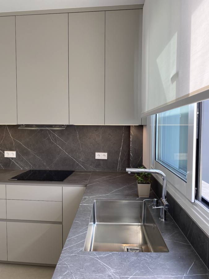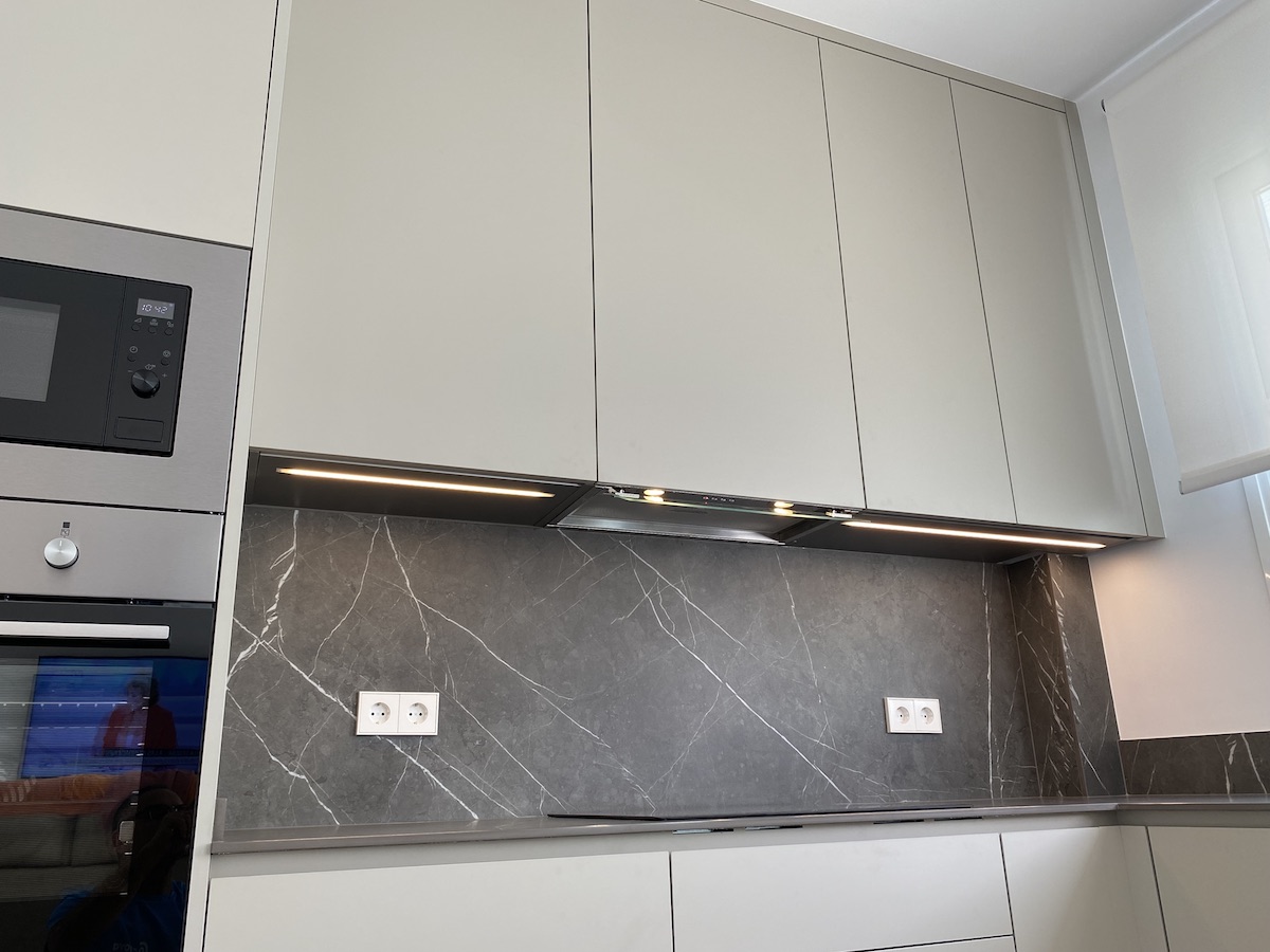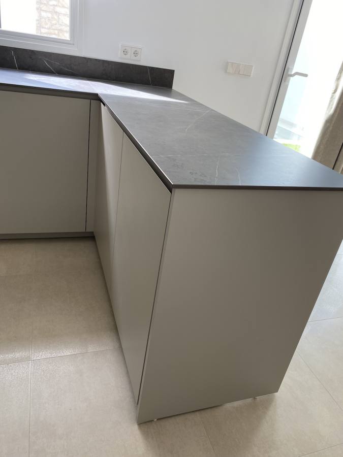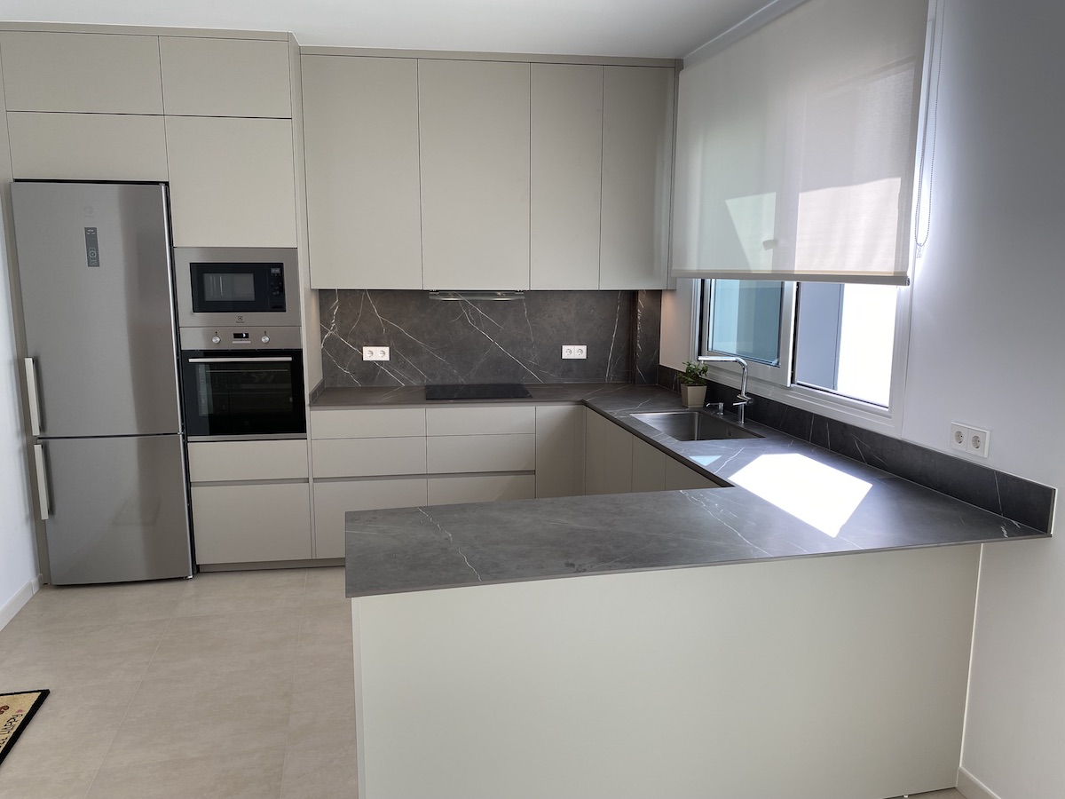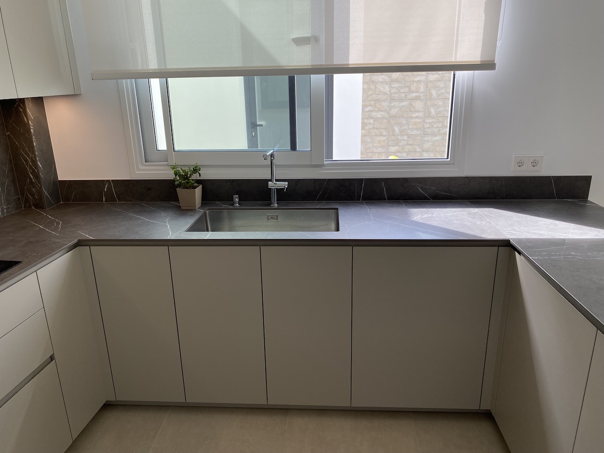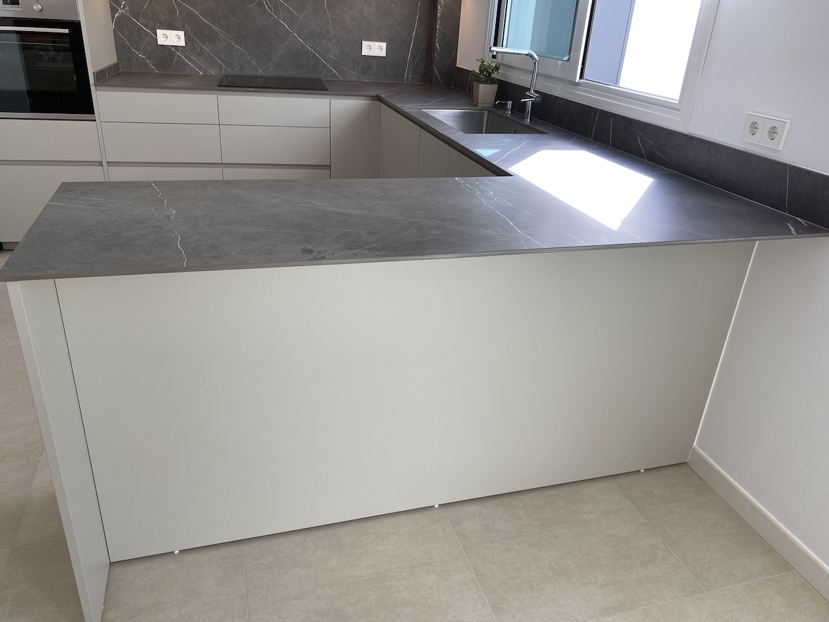 Sin embargo, el verdadero protagonista de esta cocina es la «encimera Infinity». Esta encimera, confeccionada con porcelánico italiano de la prestigiosa marca Infinity, es una maravilla de diseño. Su color gris con vetas aporta una elegancia sin igual, capturando la belleza y la profundidad de la piedra natural con la durabilidad y la resistencia del porcelánico. Su presencia eleva la estancia, haciendo de cada preparación culinaria un auténtico placer.