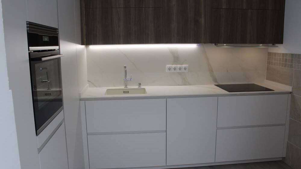 Junto a esto aparece la encimera porcelánica de laminam modelo Oro Venatto y aplacado del mismo material. El aplacado es una apuesta cada vez más habitual en cocinas modernas porque evita salpicaduras en la pared, es fácil de limpiar y con él se adopta una mayor homogeneidad en todo el conjunto.