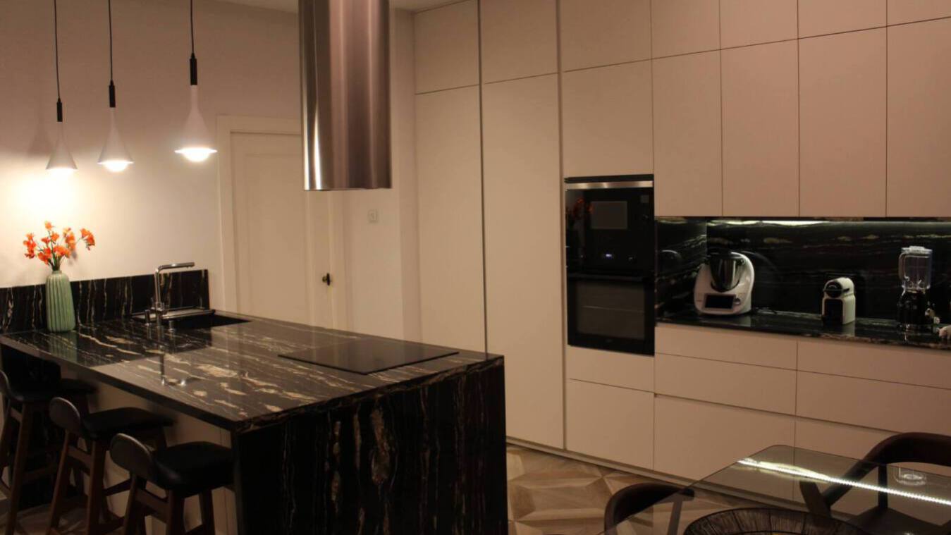 El amueblamiento hasta el techo, con armarios y cajones en color blanco, junto con la hornacina integrada, los electrodomésticos también en mueles columna… todo está pensado para hacer de esta espectacular cocina una estancia funcional donde el aspecto estético amplifique la idea de confort, calidez y elegancia.