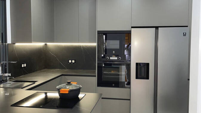 una encimera de Inalco en modelo Storm negro natural con canto simple. Los electrodomésticos son