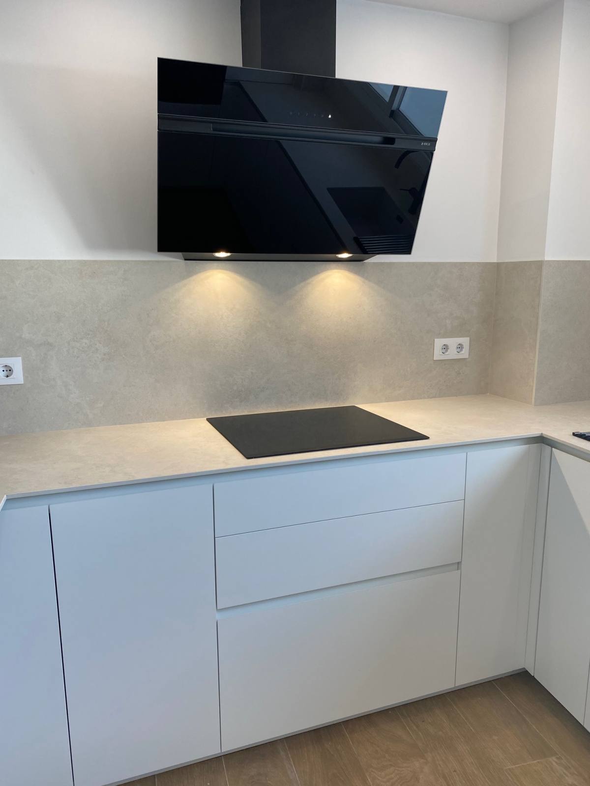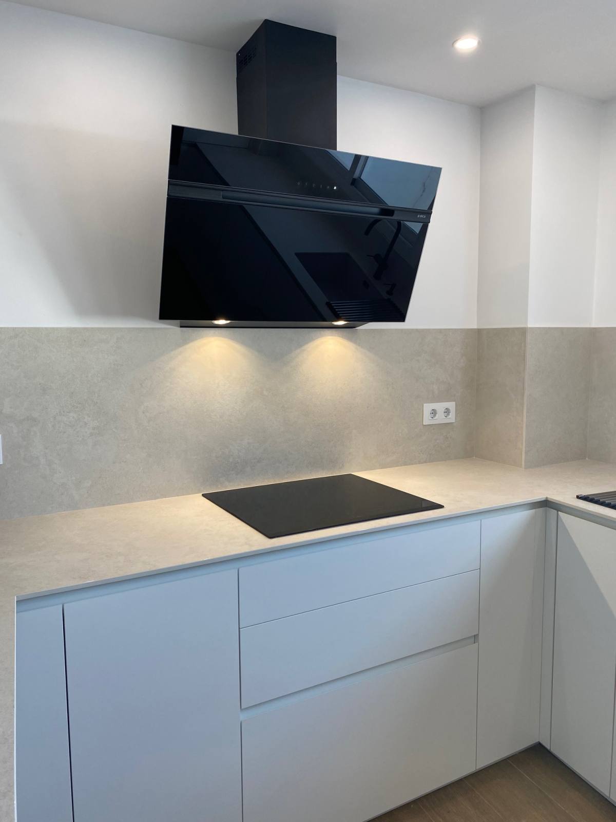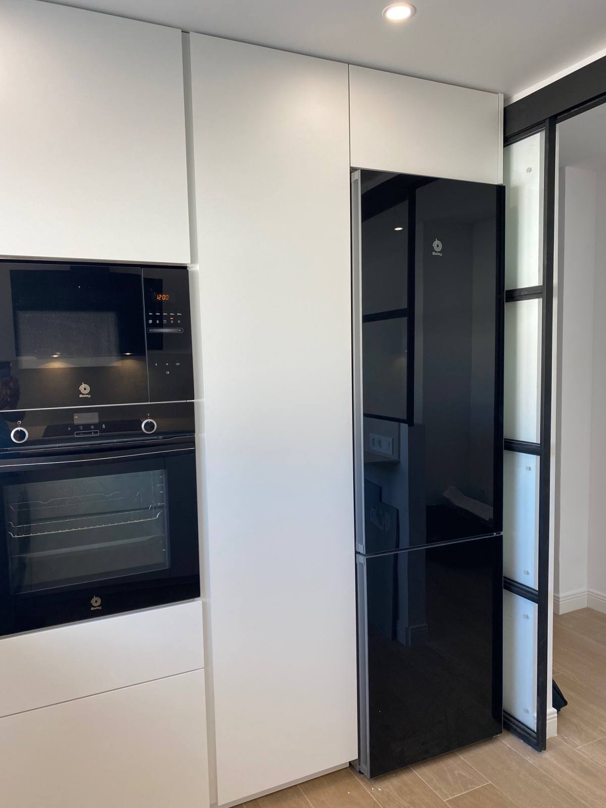 La elección de la campana inclinada en cristal negro de Elica, así como los electrodomésticos de Electrolux y la serie cristal de Balay, complementa de manera armoniosa el diseño general de esta cocina. La grifería Schock en negro es el nexo que une todos estos elementos, creando una estética cohesiva y elegante.