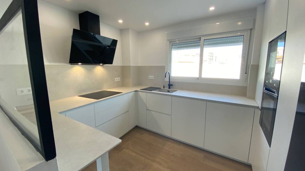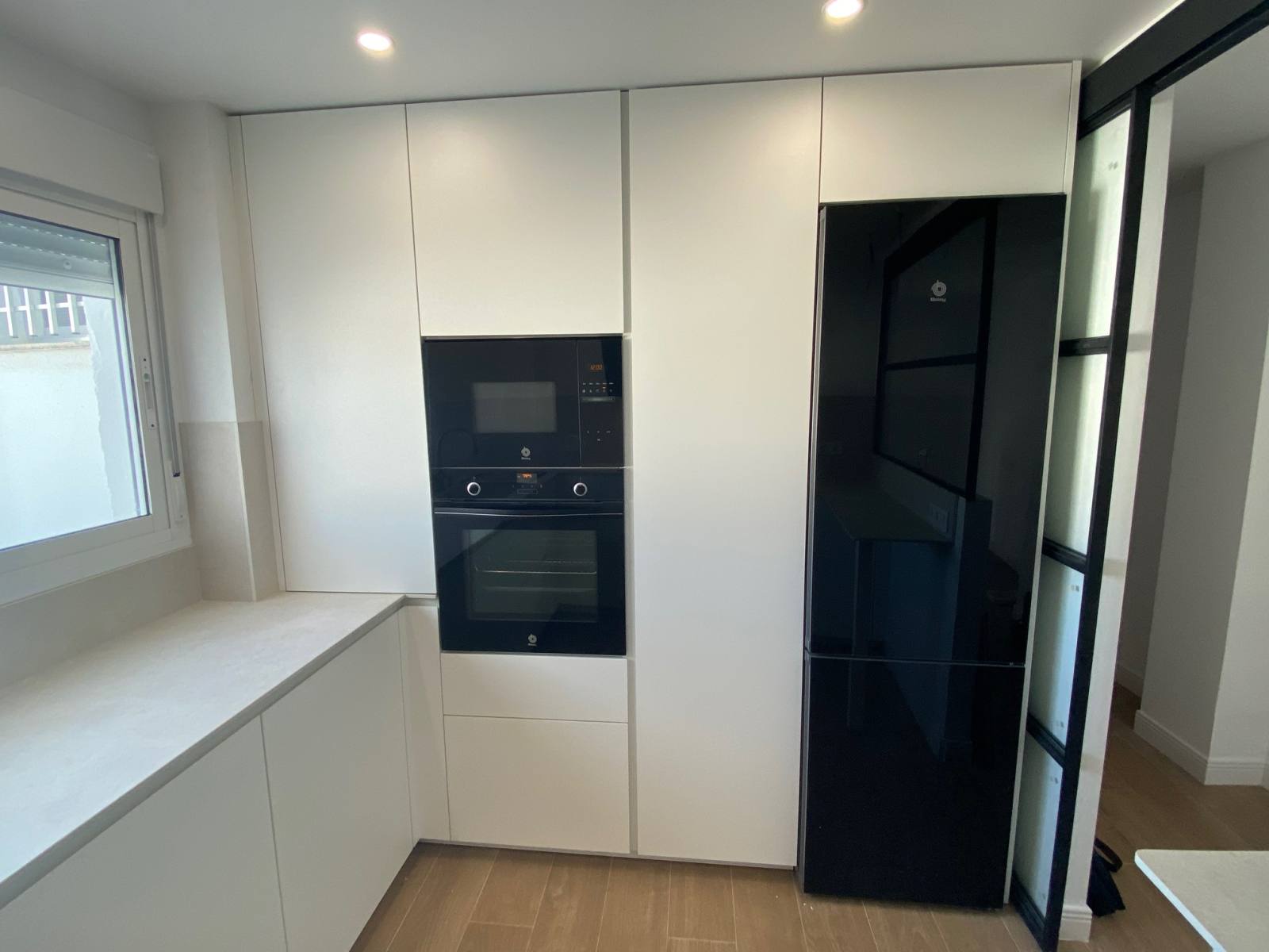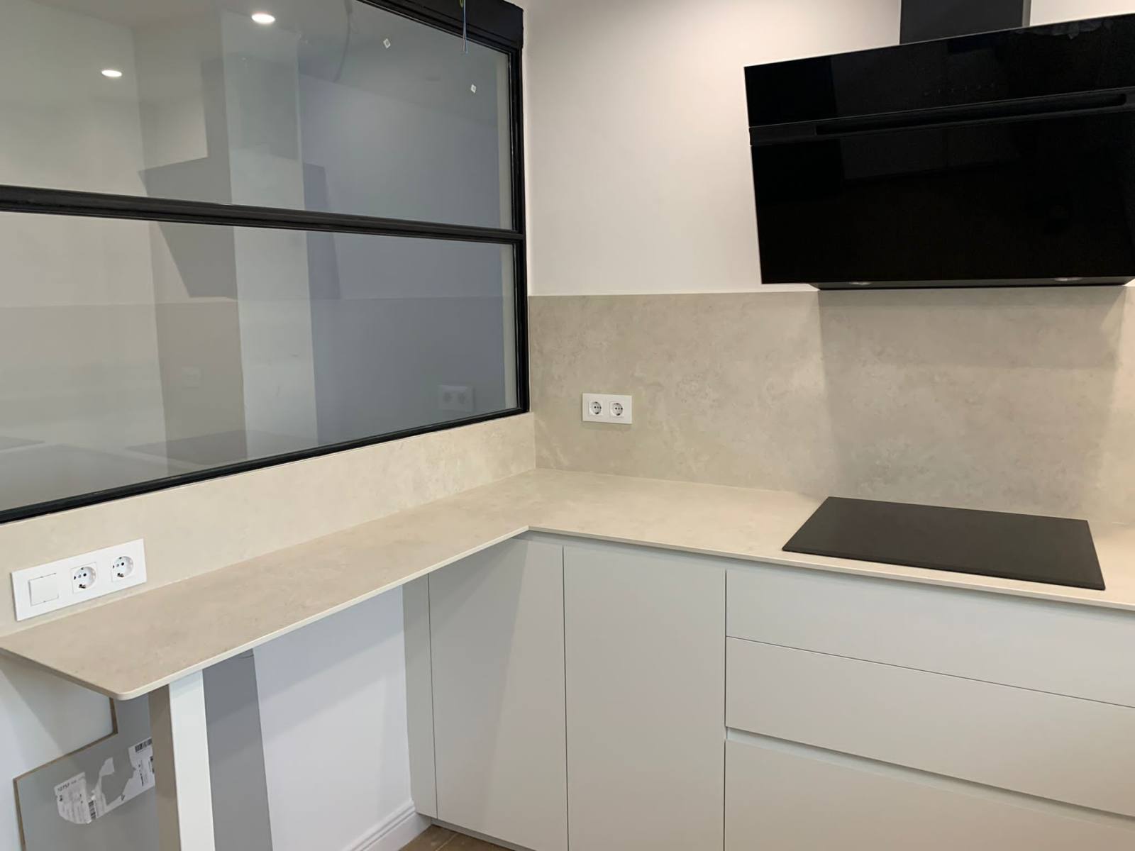 La elección de la campana inclinada en cristal negro de Elica, así como los electrodomésticos de Electrolux y la serie cristal de Balay, complementa de manera armoniosa el diseño general de esta cocina. La grifería Schock en negro es el nexo que une todos estos elementos, creando una estética cohesiva y elegante.