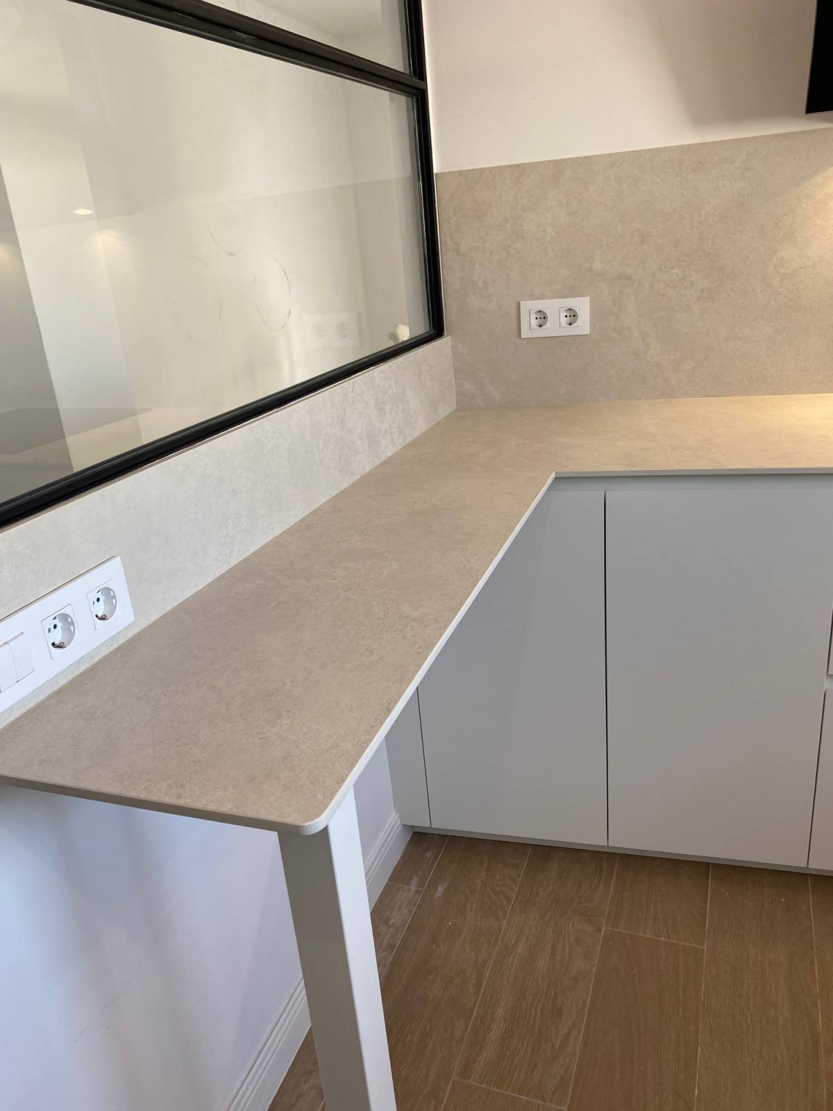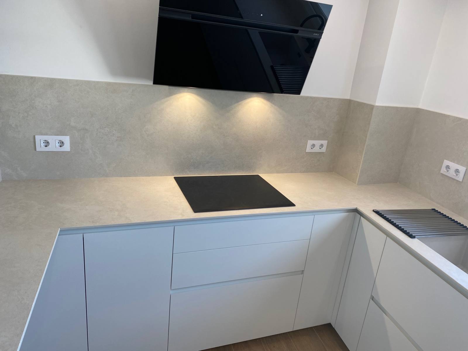 El corazón de esta cocina es el modelo Milano 45 en un atractivo color blanco polar, que crea un ambiente luminoso y moderno. La elección de una encimera Infinity, modelo Chianca di Otsuni Matte con canto simple, añade una elegancia duradera y resistente a esta área tan importante de la cocina.