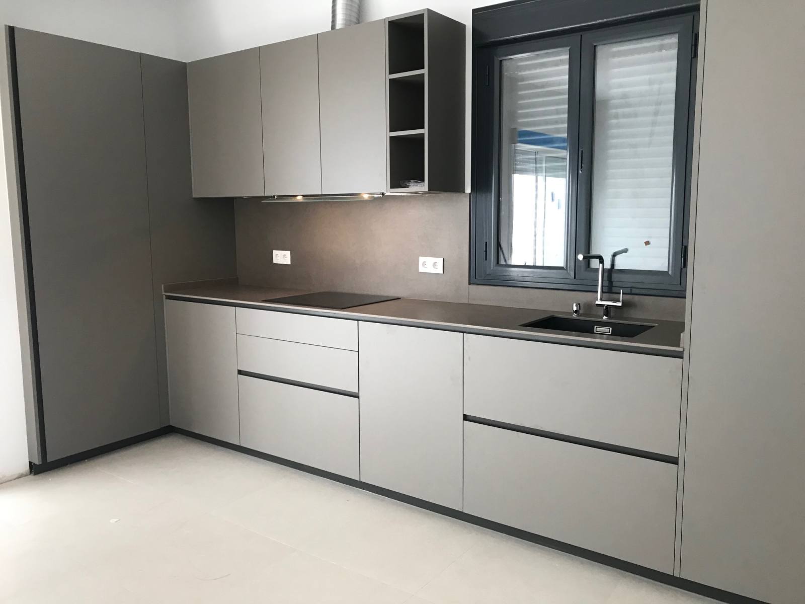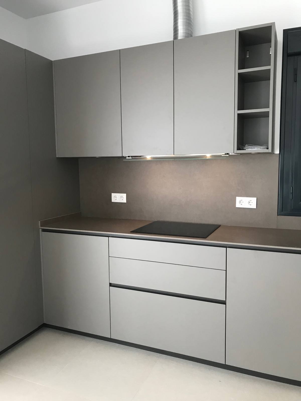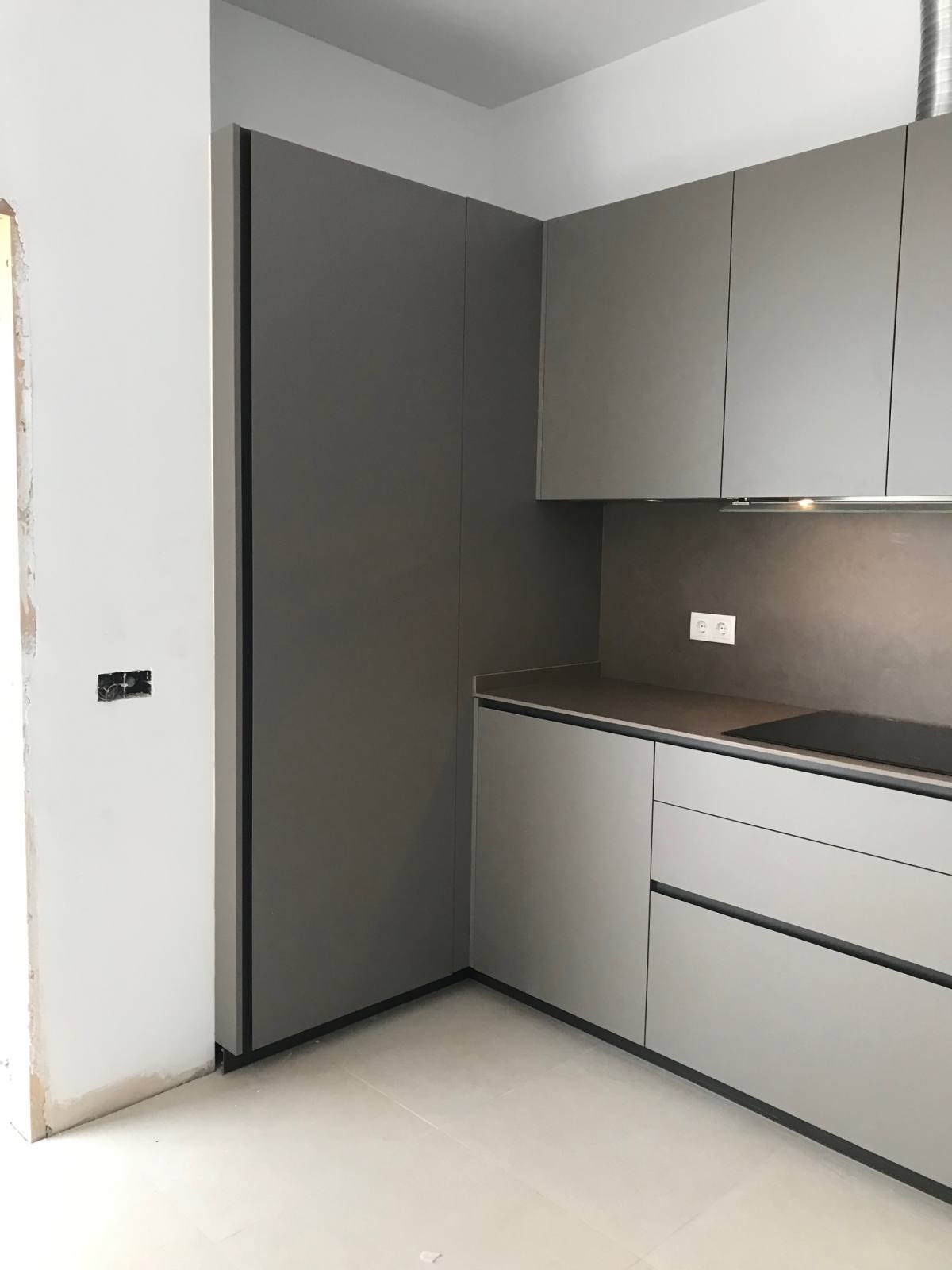 La elección de los colores Alondra y Laminam Roccia también juega un papel fundamental en la creación de un ambiente cálido y sofisticado. Los muebles en Alondra, un tono blanco reluciente, aportan una sensación de limpieza y luminosidad. Por otro lado, la encimera y el aplacado en Laminam Roccia, un tono terroso y robusto, añaden un toque de elegancia y profundidad.