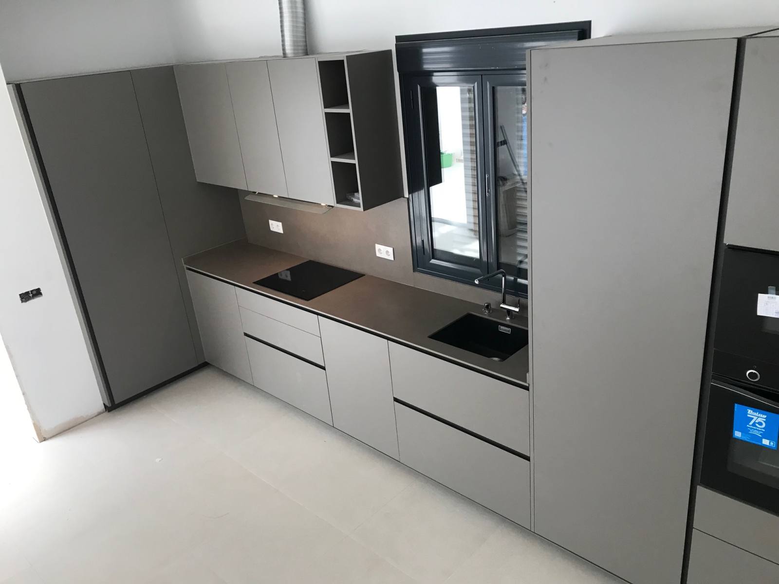 Ubicada en la localidad de Carmona, encontramos una elegante cocina lineal que presenta una combinación de colores sumamente atractiva. El blanco alondra de los muebles, complementado por el tono Laminam Roccia de la encimera y el aplacado, crea un ambiente agradable y acogedor. Pero lo que realmente destaca en este diseño es su funcionalidad, encarnada en detalles como el grifo especial abatible.